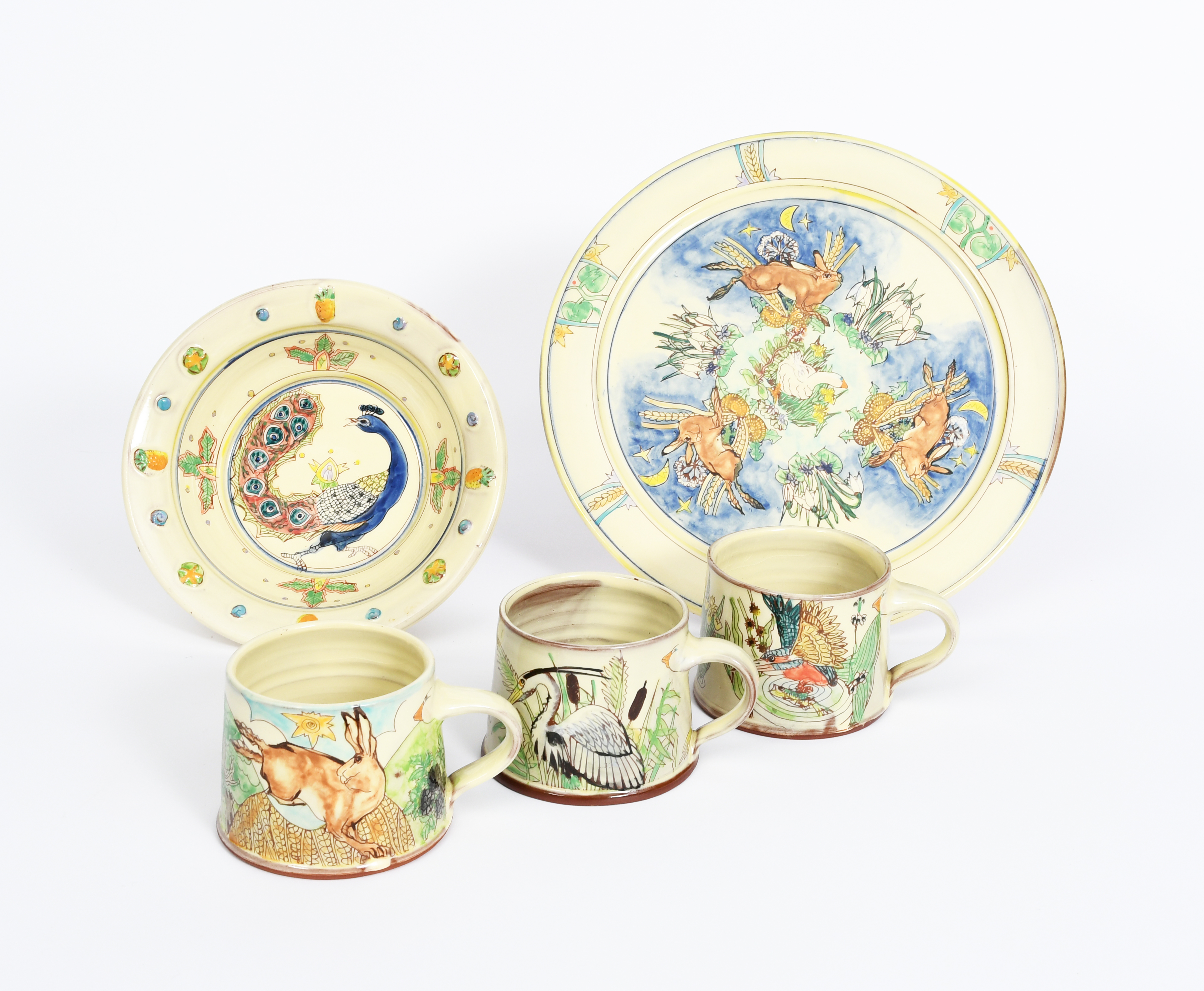 an earthenware plate, painted with radiating hares and snowdrop clumps, a white goose to the centre, painted in colours, three mugs and a bowl by Maureen Minchin