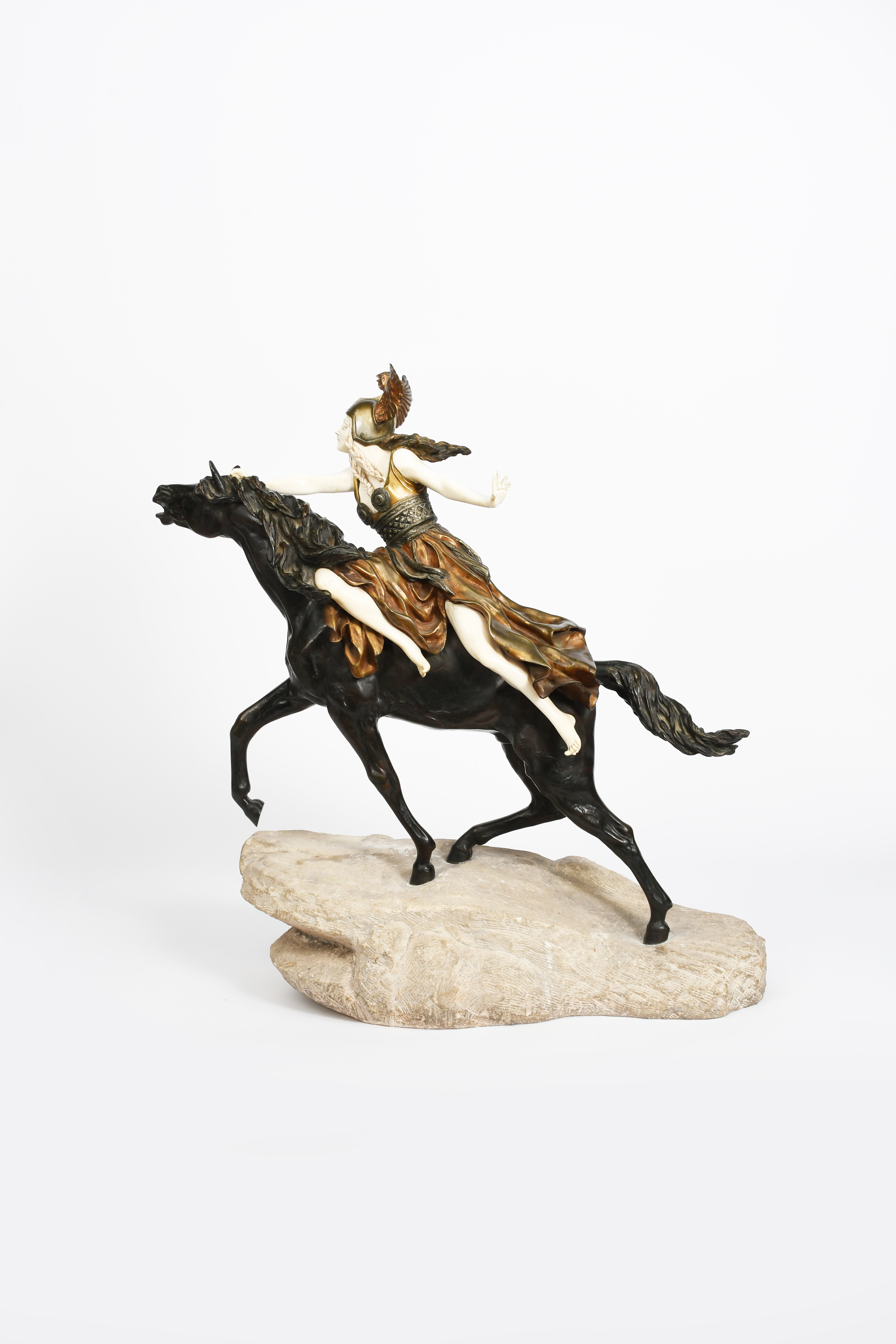 patinated and gilded bronze and ivory on textured stone base