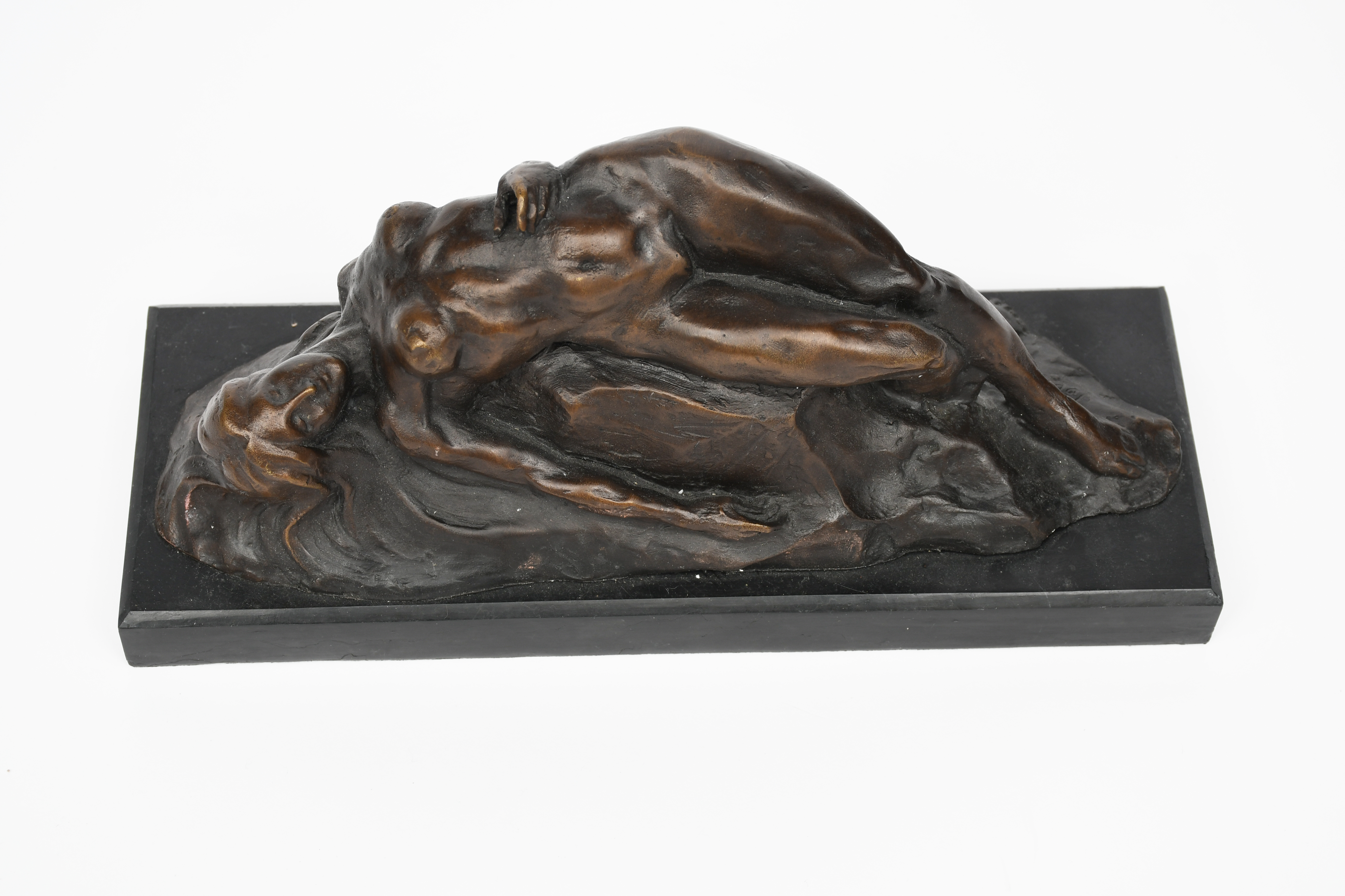 patinated bronze model of a woman reclining over rocks, on polished black slate base,