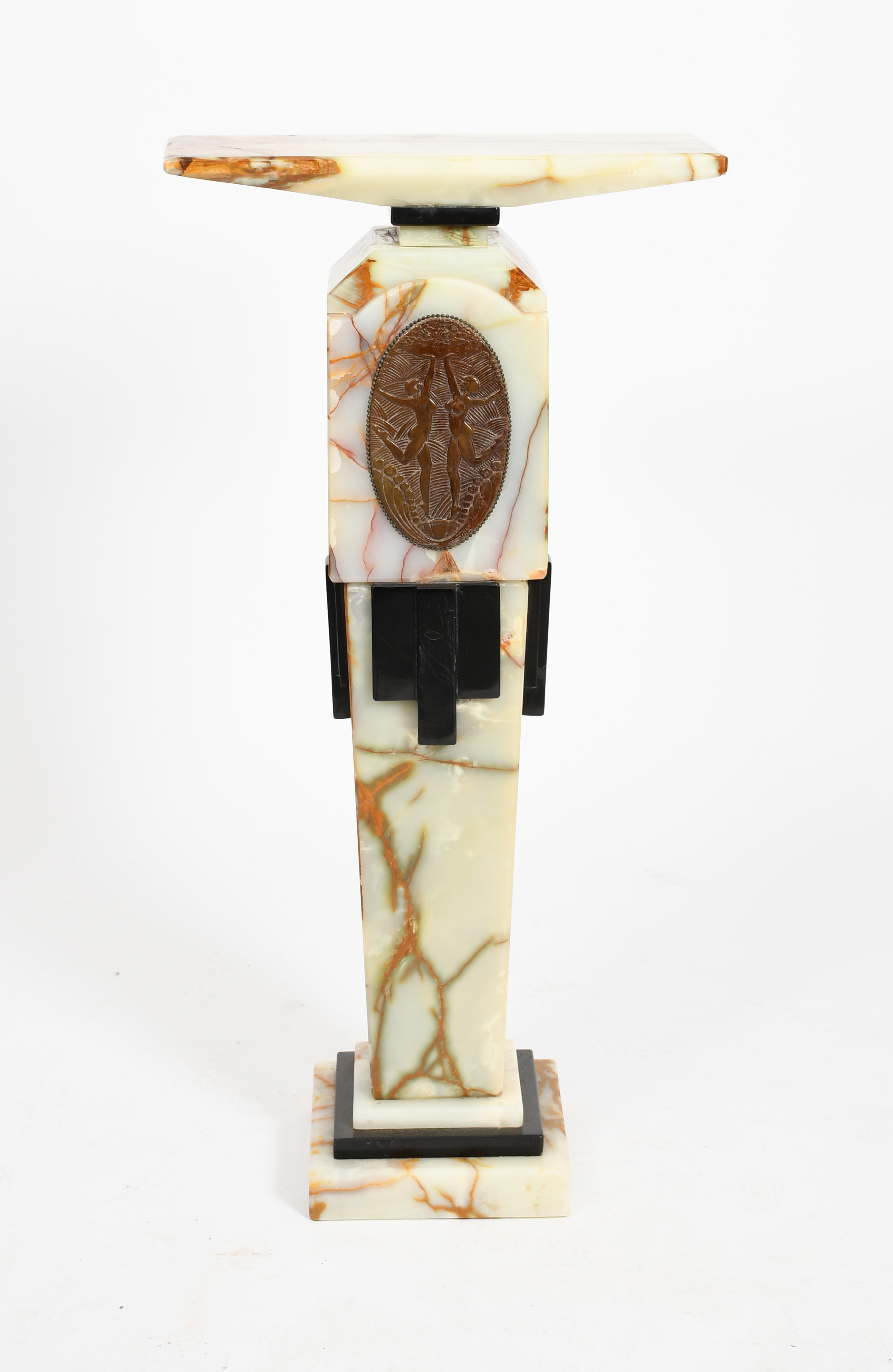 a patinated bronze, onyx and polished slate pedestal stand, tapering square section set with a bronze panel, cast in low relief with two dancers,