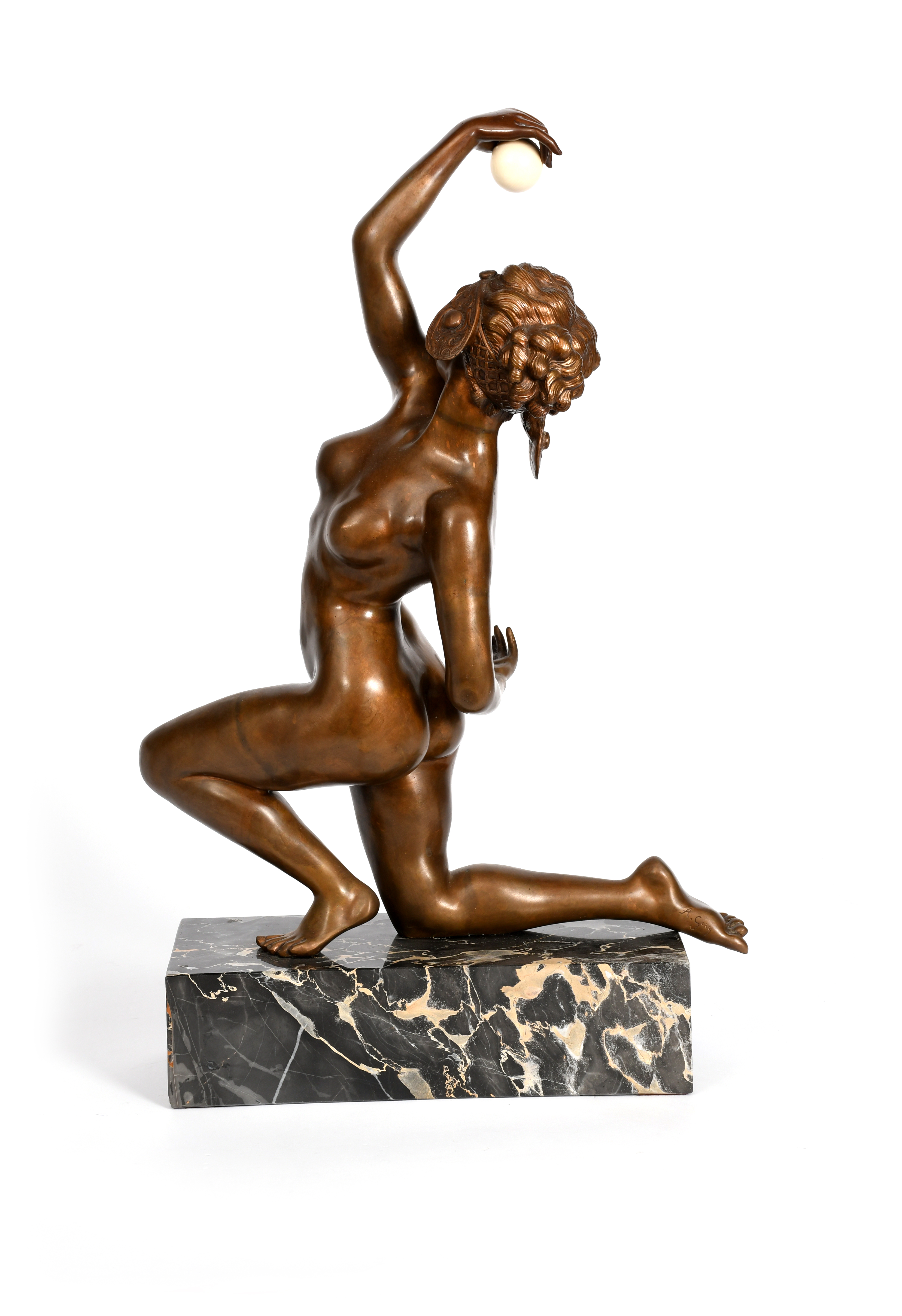 a large patinated bronze sculpture of a exotic maiden, nude, kneeling on one knee, with exotic headdress, holding an ivory ball, on veined black marble base