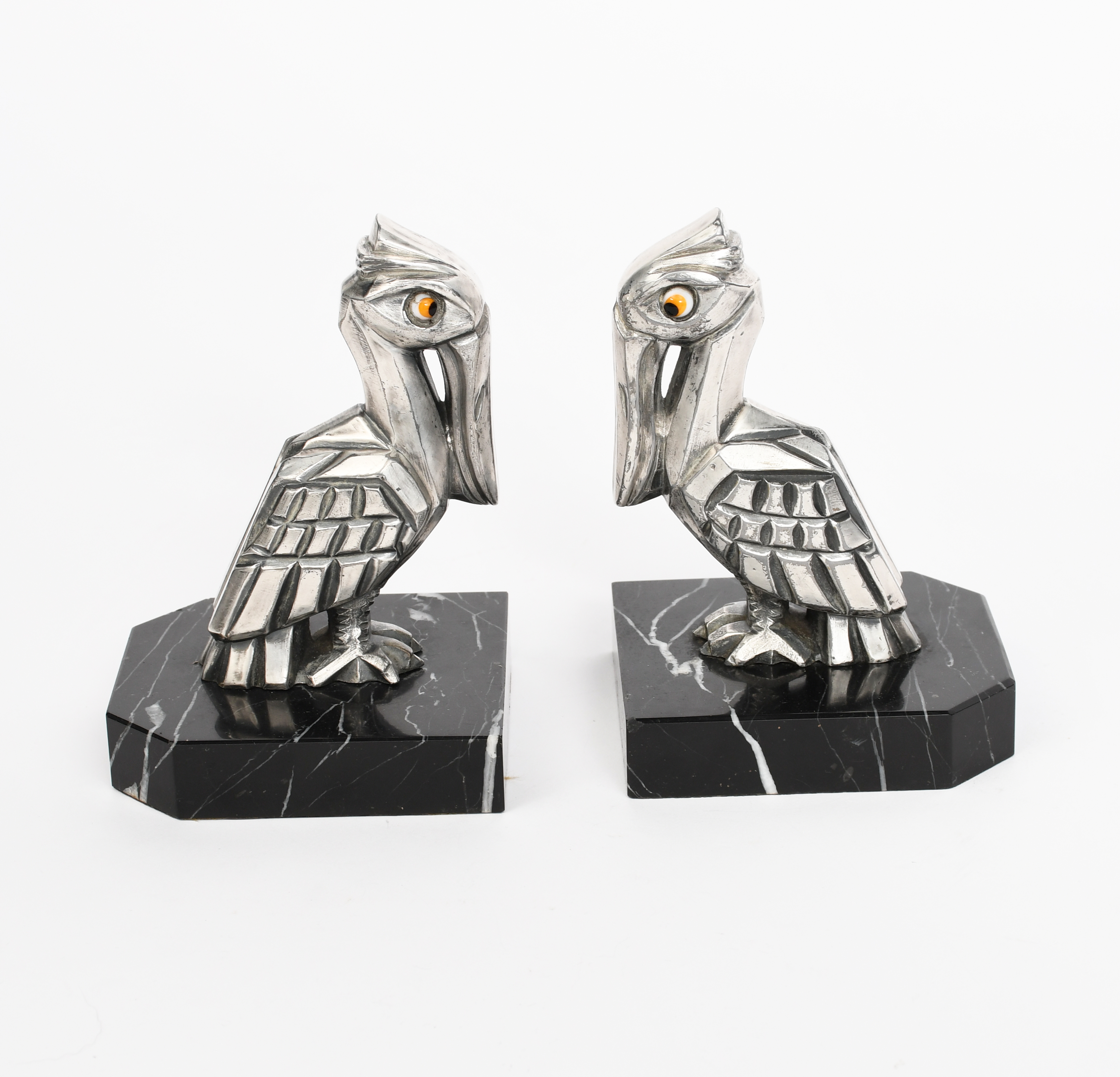 A pair of silvered metal bookends, with applied glass eyes and veined black marble bases,