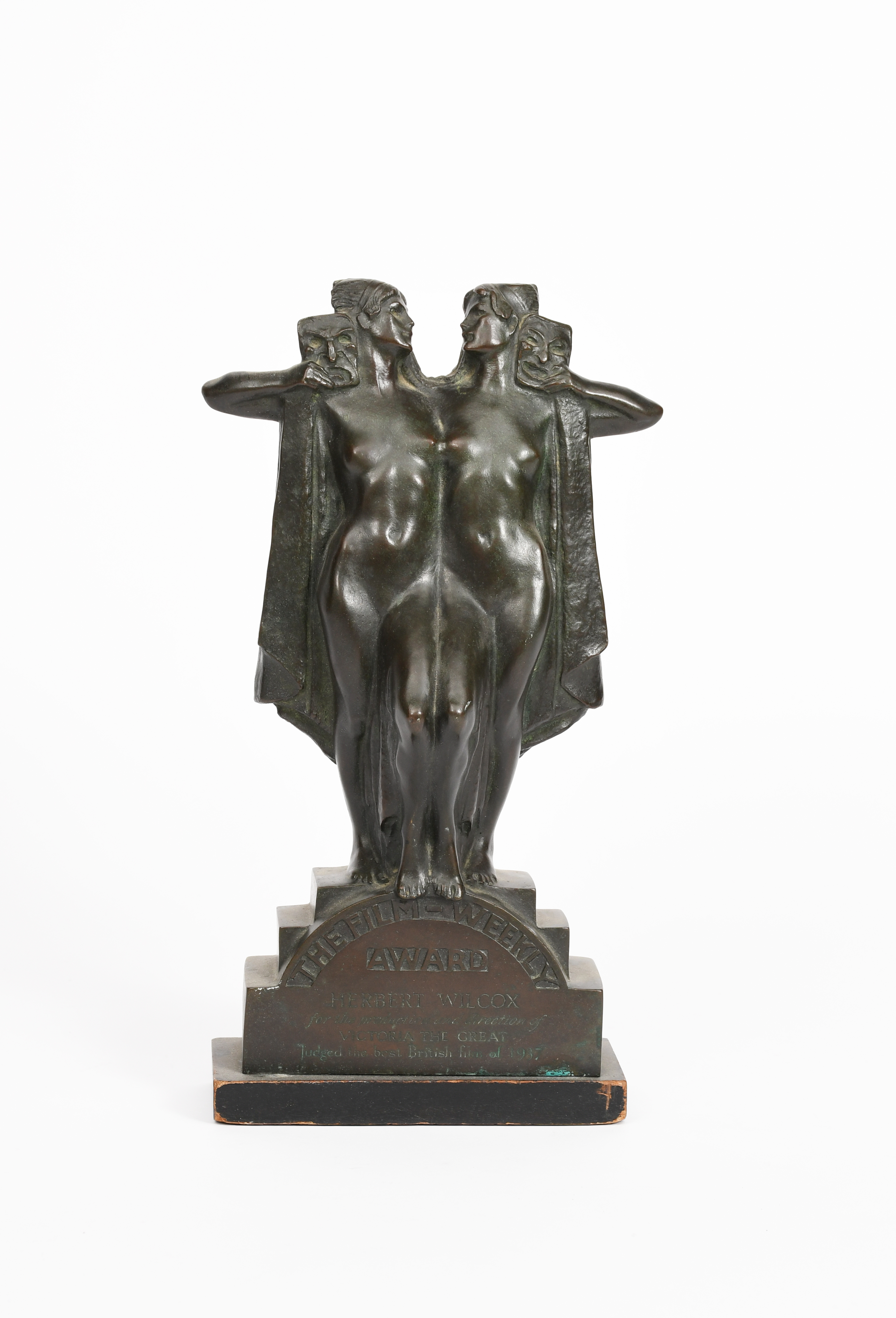 a patinated bronze sculptural award, of Comedy & Tragedy, given to Herbert Wilcox for the production and direction of Victoria the Great, best British Film, 1937, on ebonised wood base