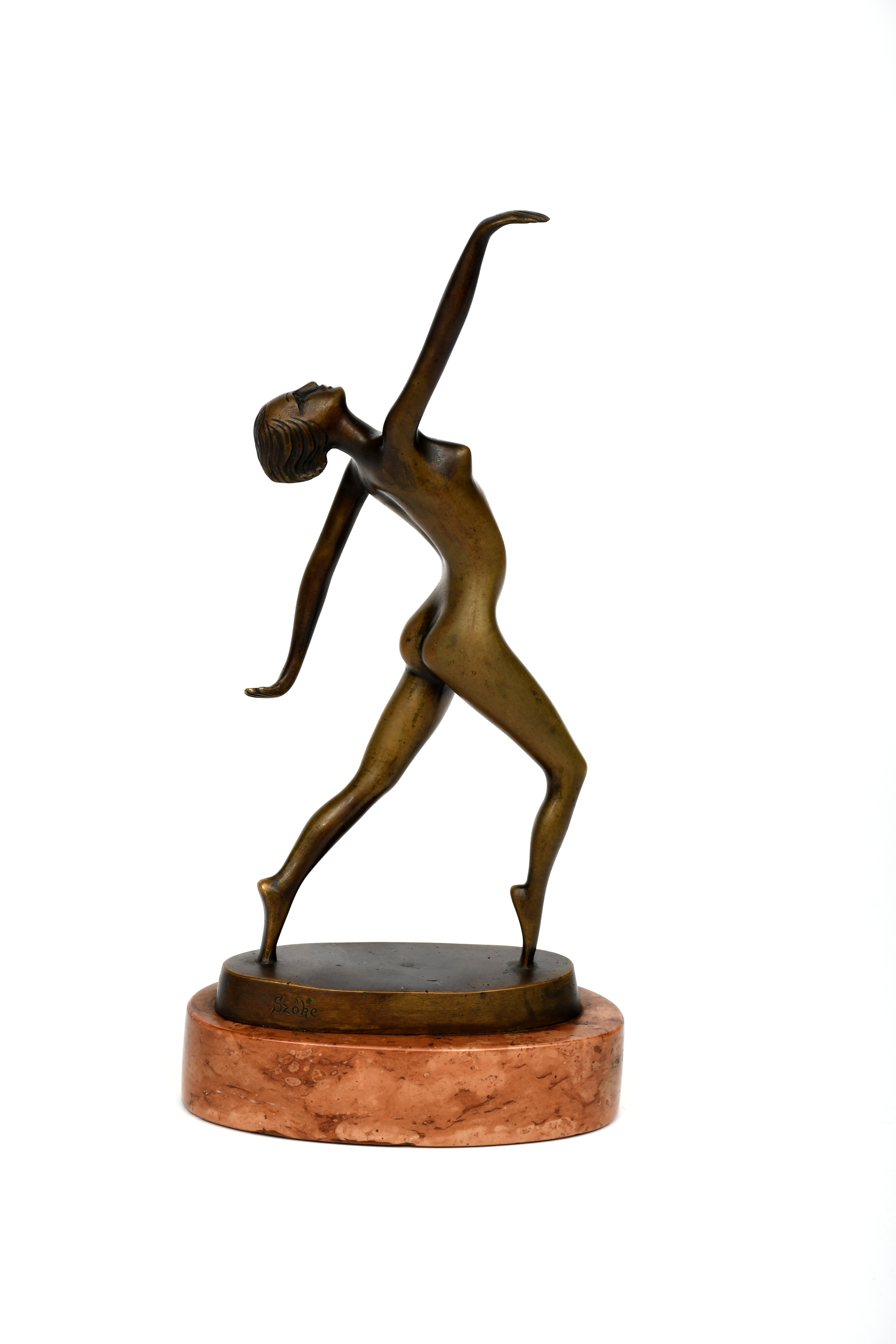 patinated bronze model of a nude female dance on her toes, arms raised, in the manner of Josef Lorenzl, on an oval red marble base