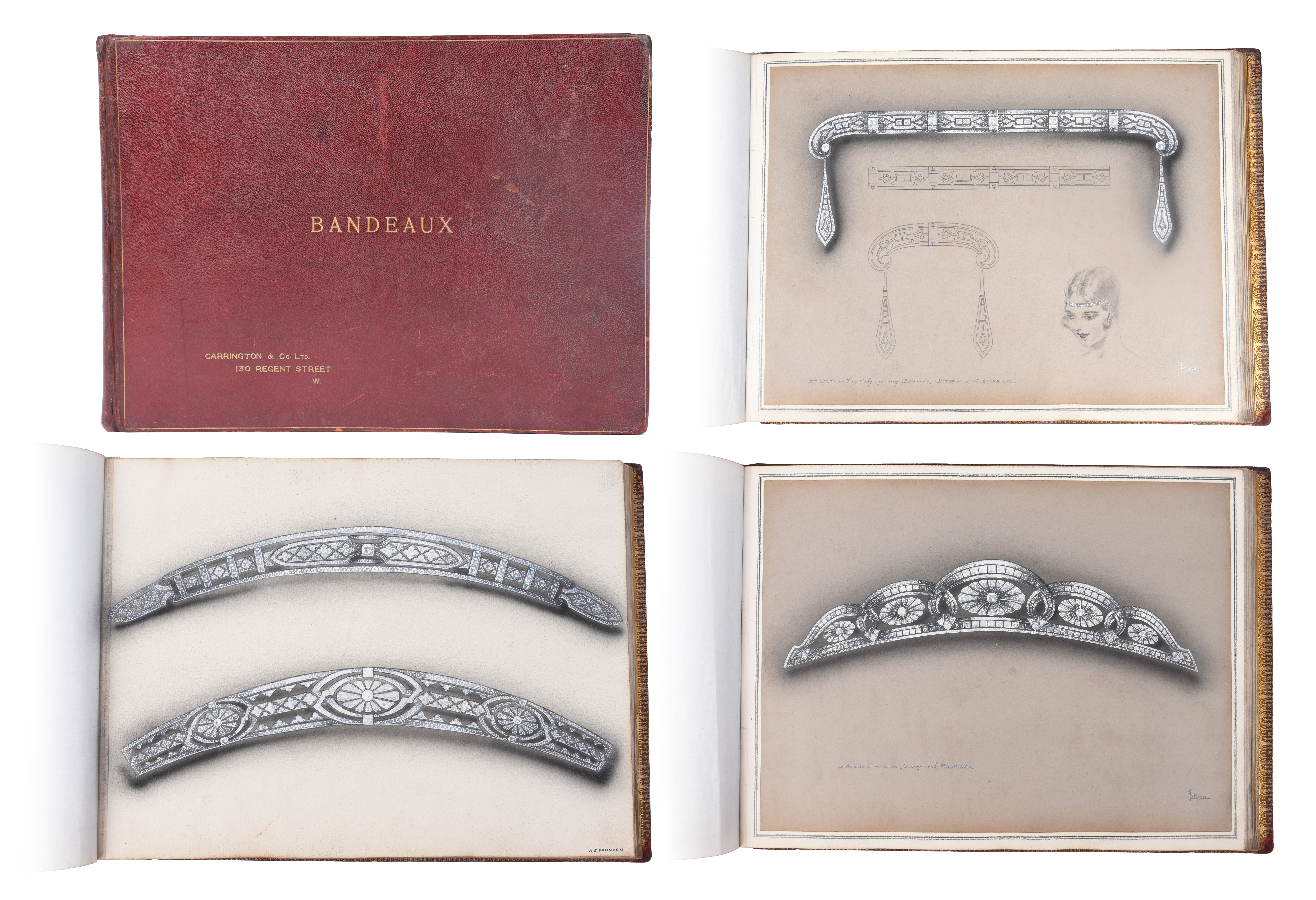 An early 20th century hardbound book of gouache jewellery designs by Carrington, the fourteen designs depicting bandeaux, sautoirs and clip brooches, the cover with gilt letters reading 'Bandeaux, Carrington & Co. Ltd, 130 Regent Street, W., 38 x 27.5