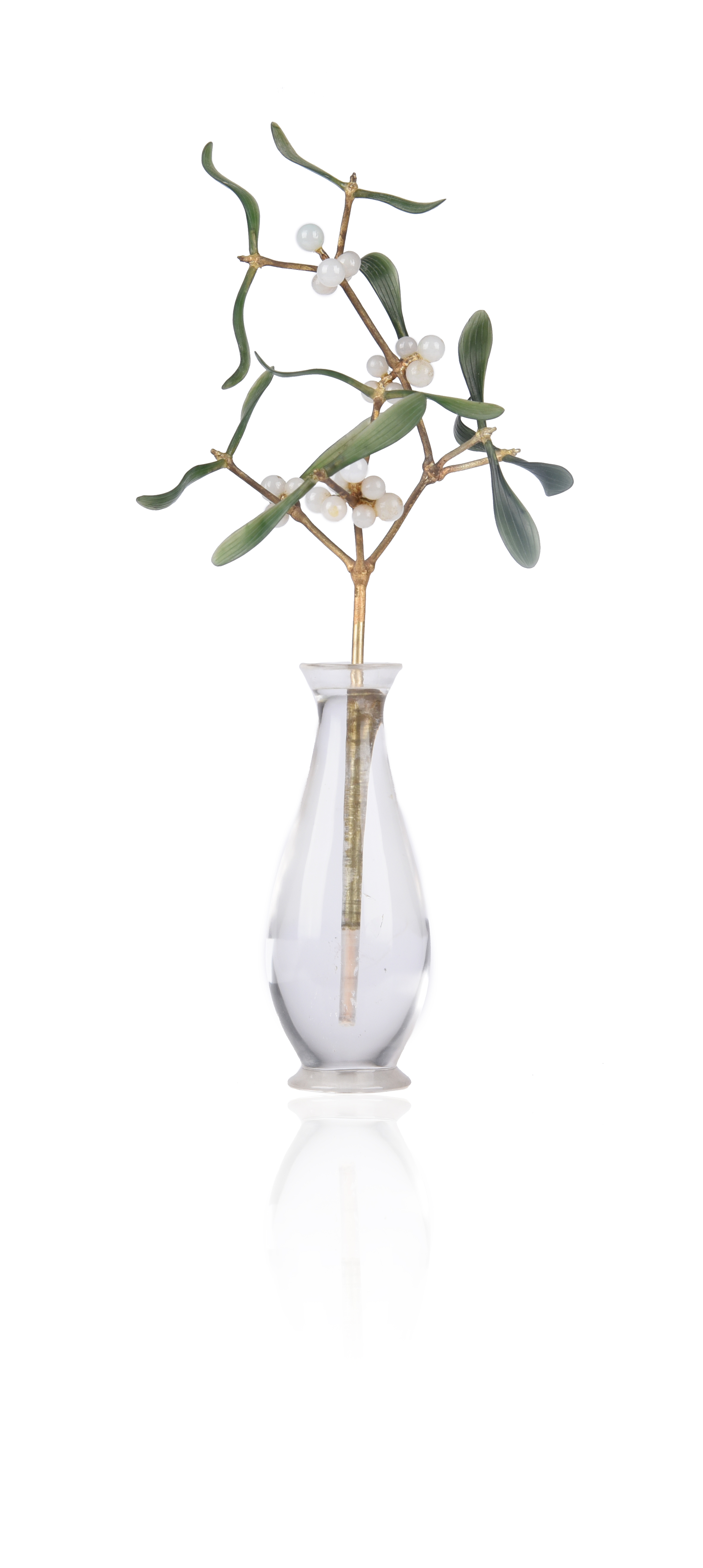 A gem-set model of a sprig of mistletoe, with white jade berries, nephrite leaves, gold stem, the rock crystal vase carved to give the appearance of being filled with water, 23cm high