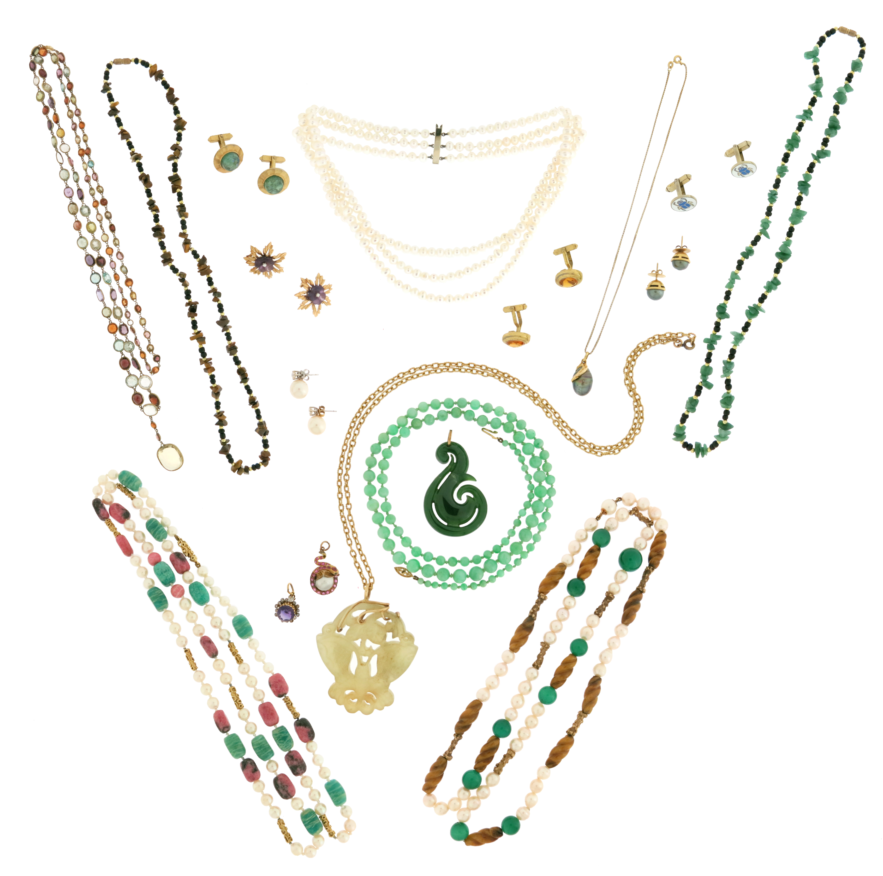 A quantity of jewellery, including a pair of cultured pearl and round brilliant-cut diamond-set gold earrings; a gem-set necklace, set with various oval-shaped gems in gold spectacle mounts; a graduated jade bead necklace; a pair of black cultured pearl earrings with pendant; a pair of diamond-centred carved amethyst flowerhead earrings with gold leaves; an untested blister pearl pendant with coiled gold snake set with rubies in closed-back mount; a circular-cut amethyst and diamond cluster pendant, three pairs of cufflinks, two hardstone pendants and four assorted necklaces