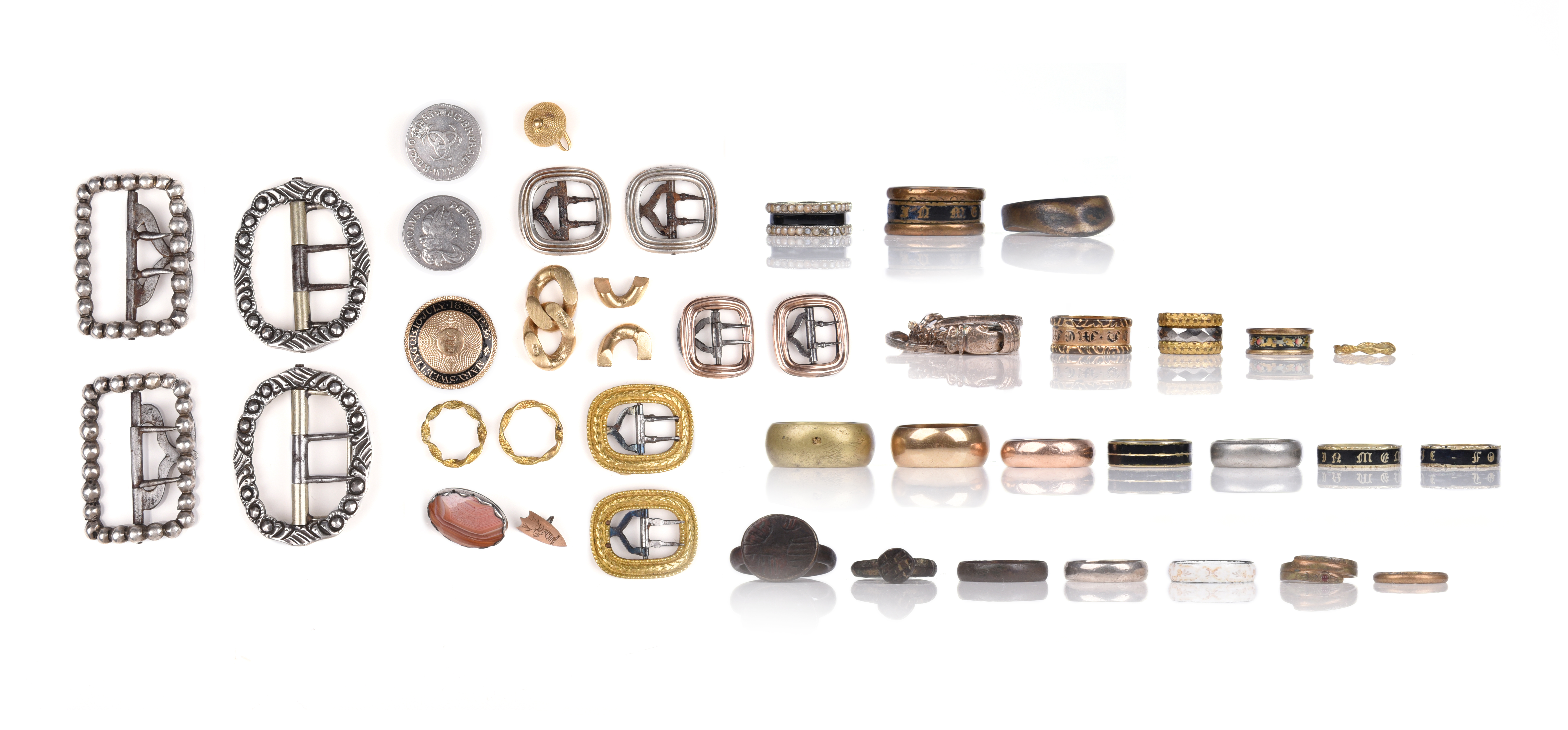 Various items of antique jewellery, including a silver Fedé gimmel ring, a metal snake ring with cabochon red stone eye, five enamelled base metal mourning rings, a metal Archer's ring, a pair of silver buckles, a pair of metal buckles and various other items