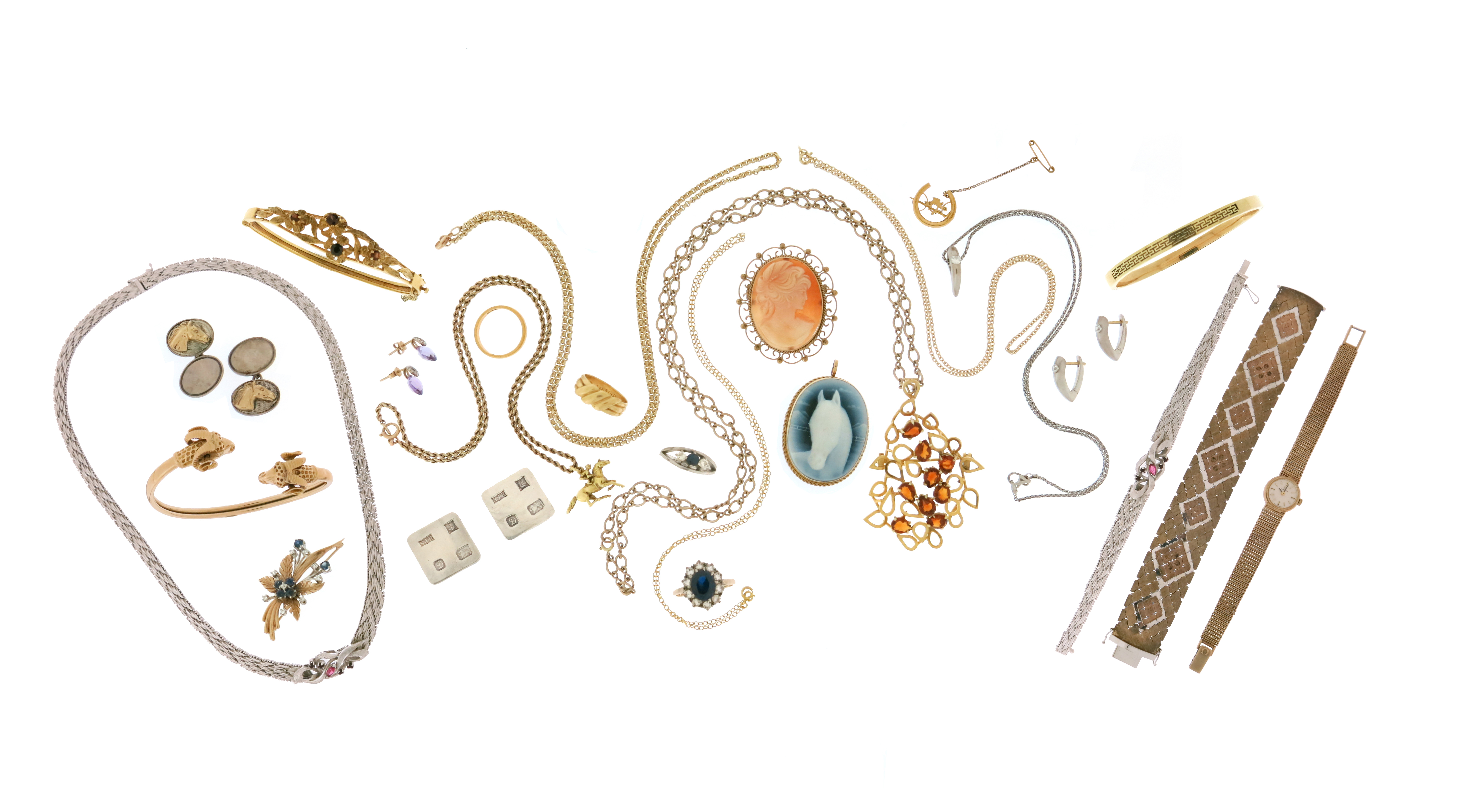 Various items of jewellery, including a pair of diamond-set 18ct white gold earrings with matching diamond set 18ct gold pendant on a fine-link 18ct white gold chain; an 18ct gold horse and jockey pendant on a twisting gold chain; an 18ct white gold ring set with two diamonds and a sapphire; a 9ct gold blue and white paste cluster ring; a sapphire and diamond-set gold foliate brooch; a 22ct gold wedding ring; an 18ct gold twist design ring; two fine-link gold chains; two gold hinged bangles; a gold pendant set with citrines on a fancy-link gold chain; two cameo brooches; two pairs of cufflinks; a pair of amethyst and diamond-set drop earrings, a gold open bangle with ram's head terminals; a lady's gold omega wristwatch with gold mesh band, a lady's gold wristwatch by Tudor with 9ct gold Rolex band; a gold horseshoe bar brooch and a stone-set necklace with matching bracelet and a gilt metal bracelet