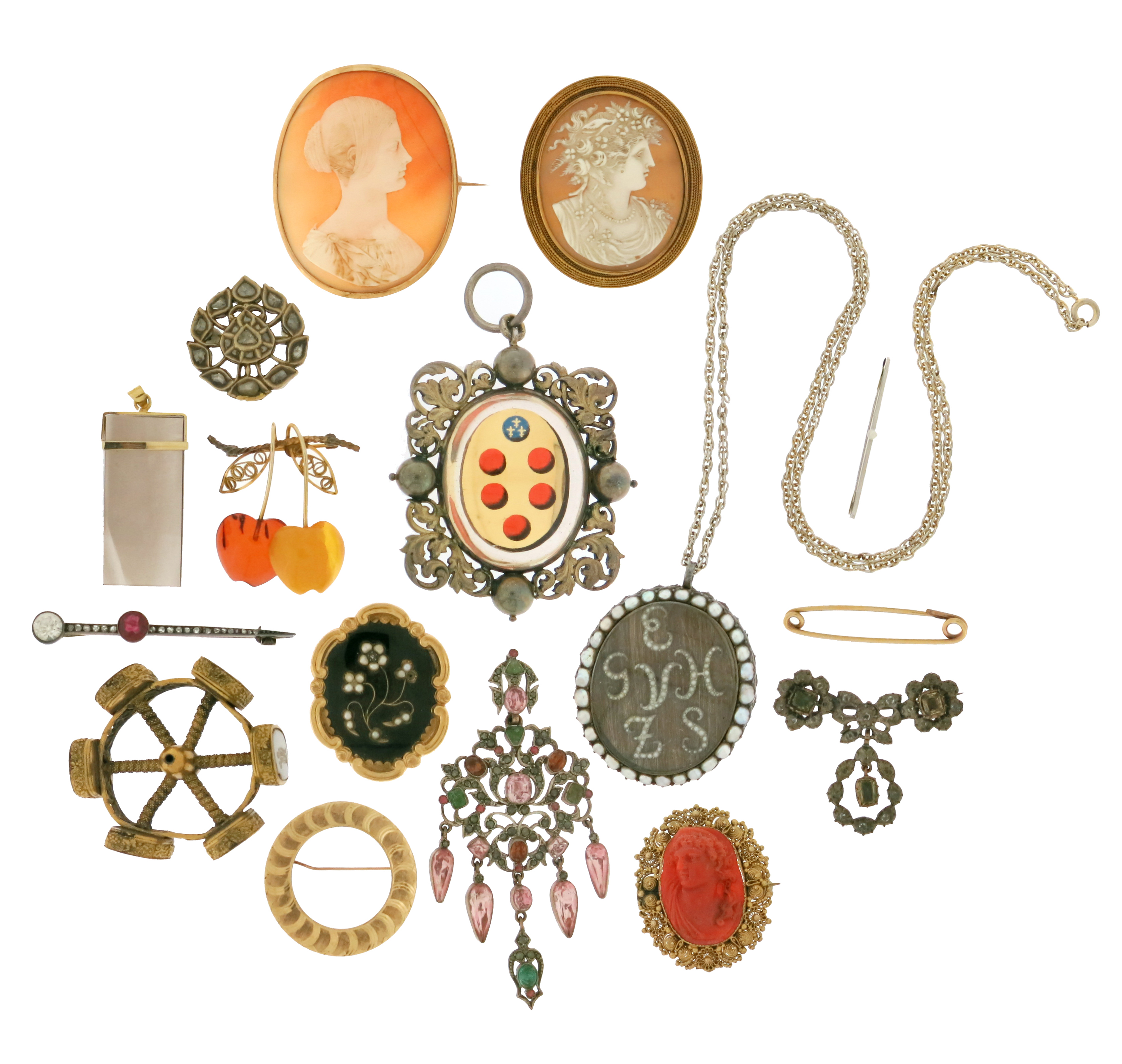 ‡ A collection of jewellery, including; three 19th century cameo brooches; one shell cameo possibly depicting a young Queen Victoria in gold; one shell cameo set within a gold ropetwist surround; one red coral cameo possibly depicting the goddess Juno in a gold wirework and pellet surround, 4 - 5.5cm high; two 19th century pendants; one with rock crystal centre section containing the Medici coat of arms within a gilt metal foliate surround; the other mourning pendant with double-sided glazed sections; one side containing a miniature of an urn; the reverse containing hair and seed pearls letters within a border of seed pearls; on a fine-link silver gilt chain; a tourmaline and marcasite pendant; a gold stock pin; an Indian diamond-set pendant; an antique diamond; an emerald pendant and other assorted items