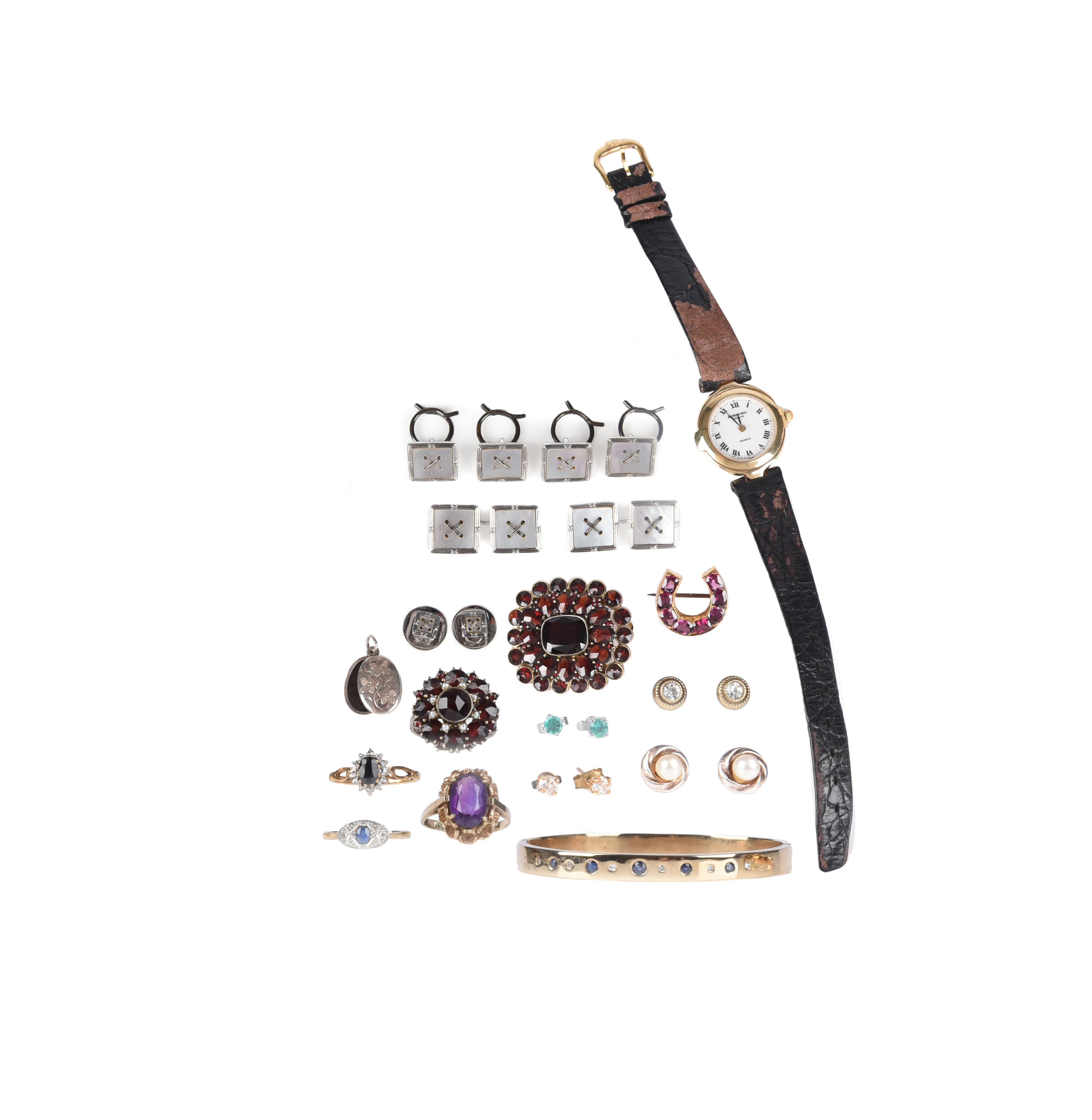 A small quantity of jewellery, including; a sapphire and diamond-set gold bangle; a cased set of white gold cufflinks designed as tide shell buttons; a sapphire and diamond-set three-stone ring; a garnet-set horseshoe brooch; an amethyst-set gold ring; four pairs of ear studs, a garnet brooch, a garnet ring, a sapphire and diamond cluster ring, and a lady's quartz wristwatch