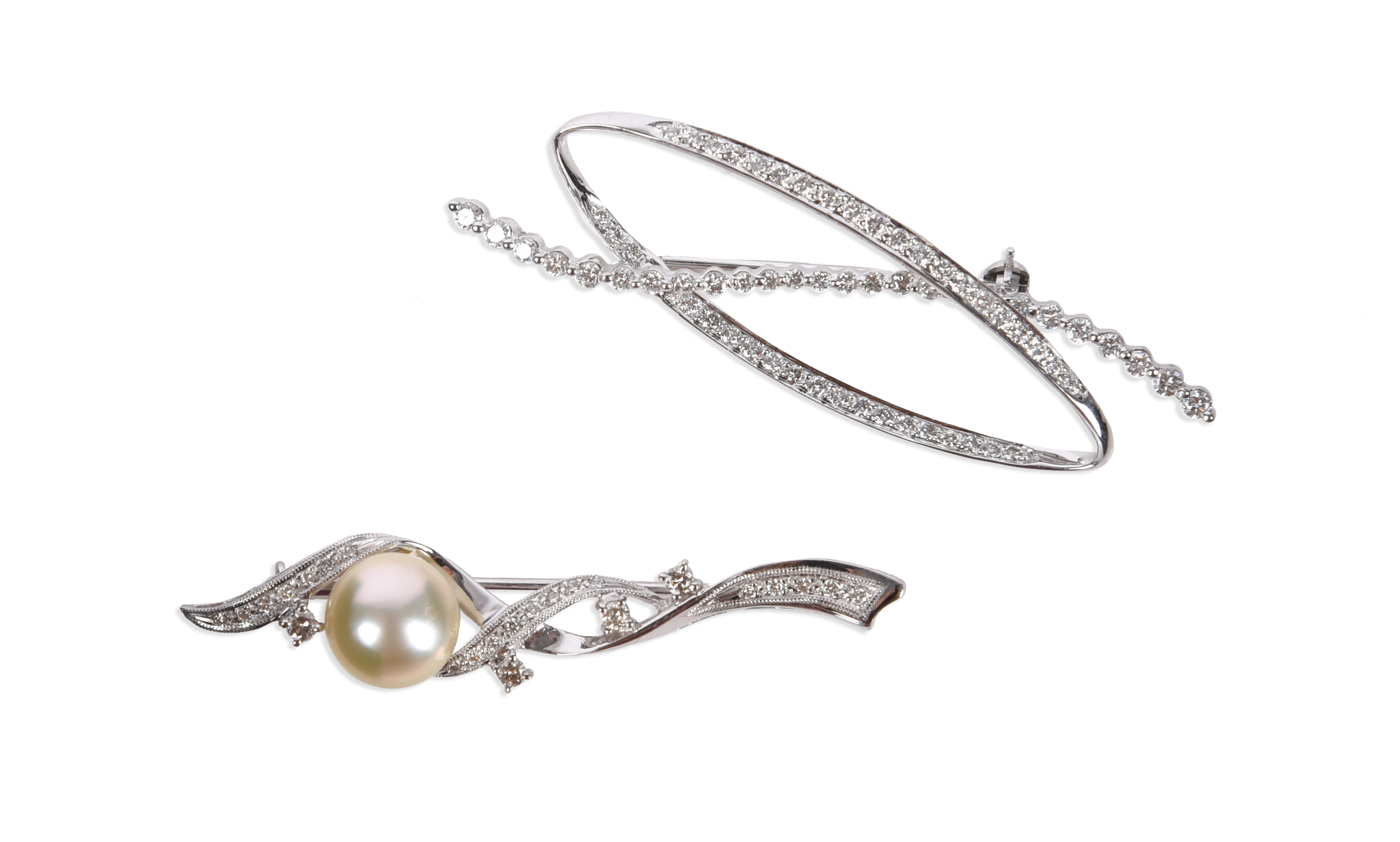 Two white gold brooches, one set with a cultured pearl and both set with circular-cut diamonds, 5-5.5cm wide