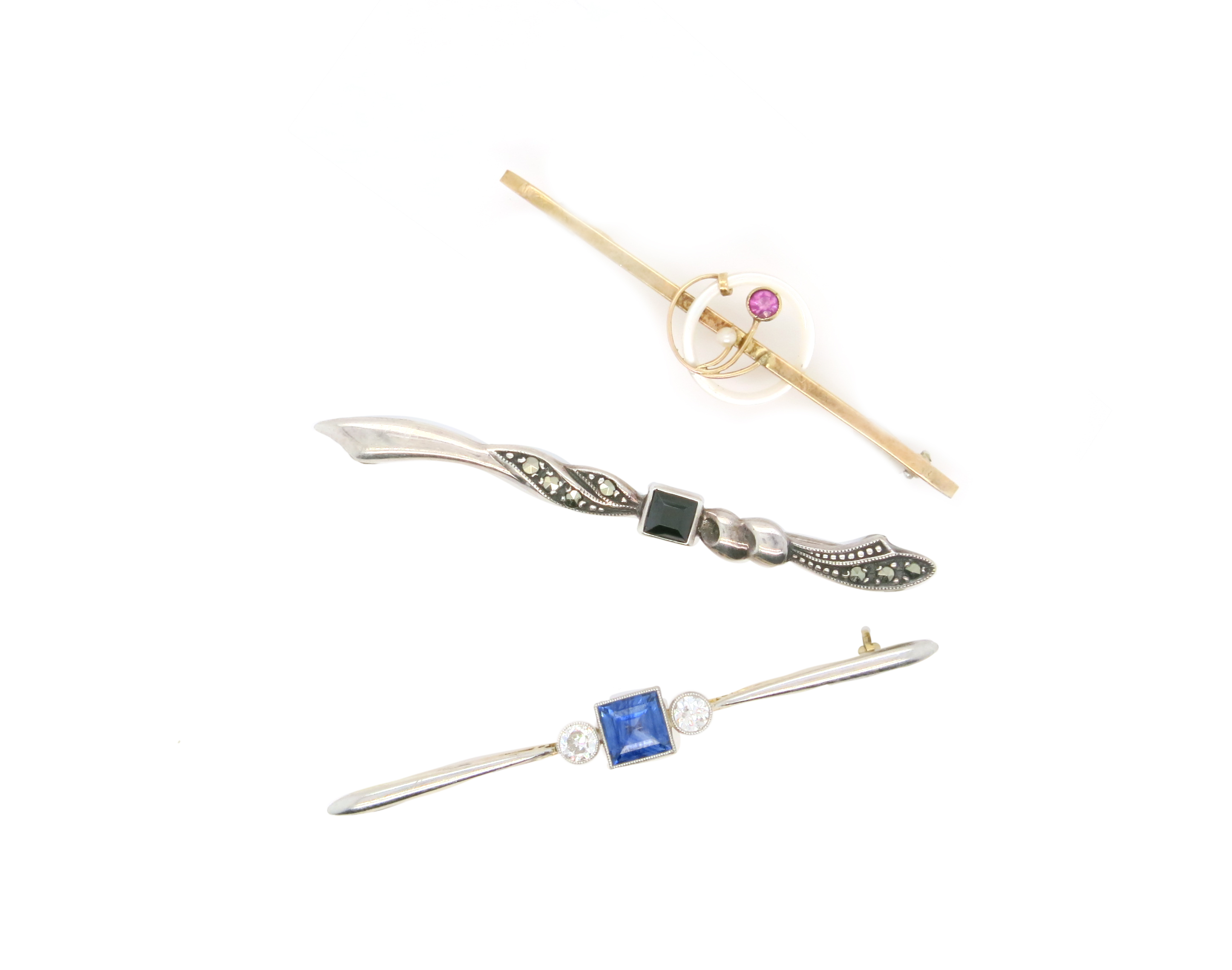 Three gem-set bar brooches, a sapphire and diamond three-stone bar brooch set in platinum and gold, an onyx and marchasite-set silver bar brooch, and a pink stone and seed pearl-set gold bar brooch in fitted case