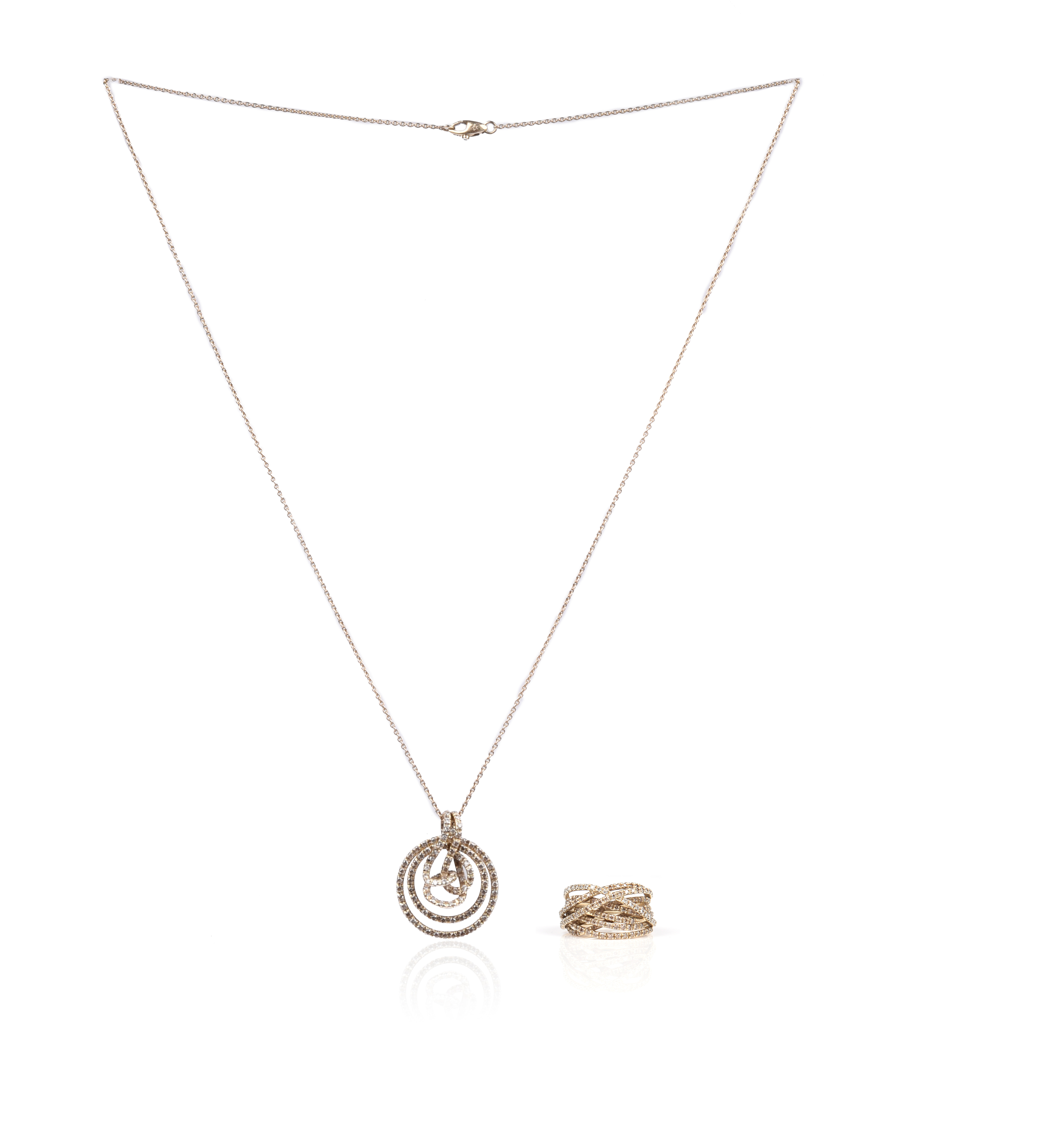A fancy-coloured diamond ring and pendant by H.Stern, the multi-hoop ring set with circular-cut fancy-coloured diamonds in gold, with a matching pendant on fine-link gold neck chain, both stamped 750, ring size O 1/2