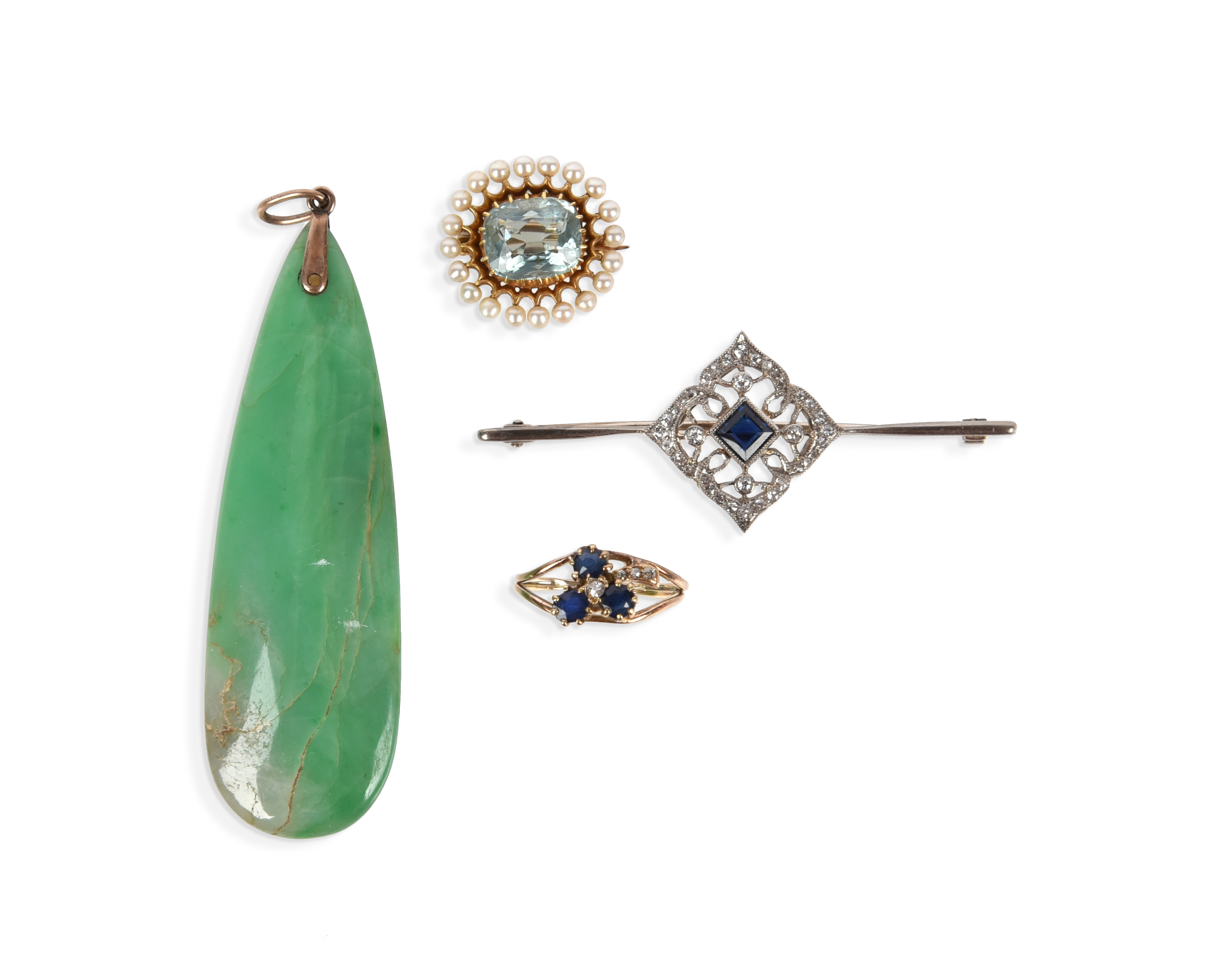 A small quantity of jewellery, including a jade drop pendant, a sapphire and diamond-set gold ring, an Edwardian sapphire and diamond bar brooch and an Edwardian seed pearl and aquamarine brooch
