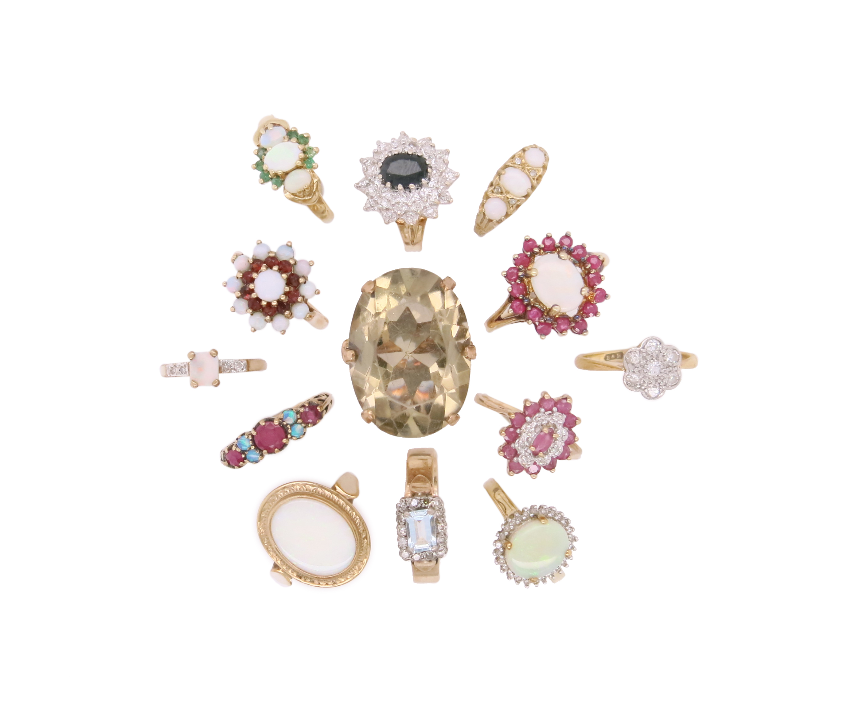 13 gem-set gold rings, including an opal and ruby half hoop ring, a diamond cluster ring, an opal and ruby cluster ring and ten other gem-set gold rings