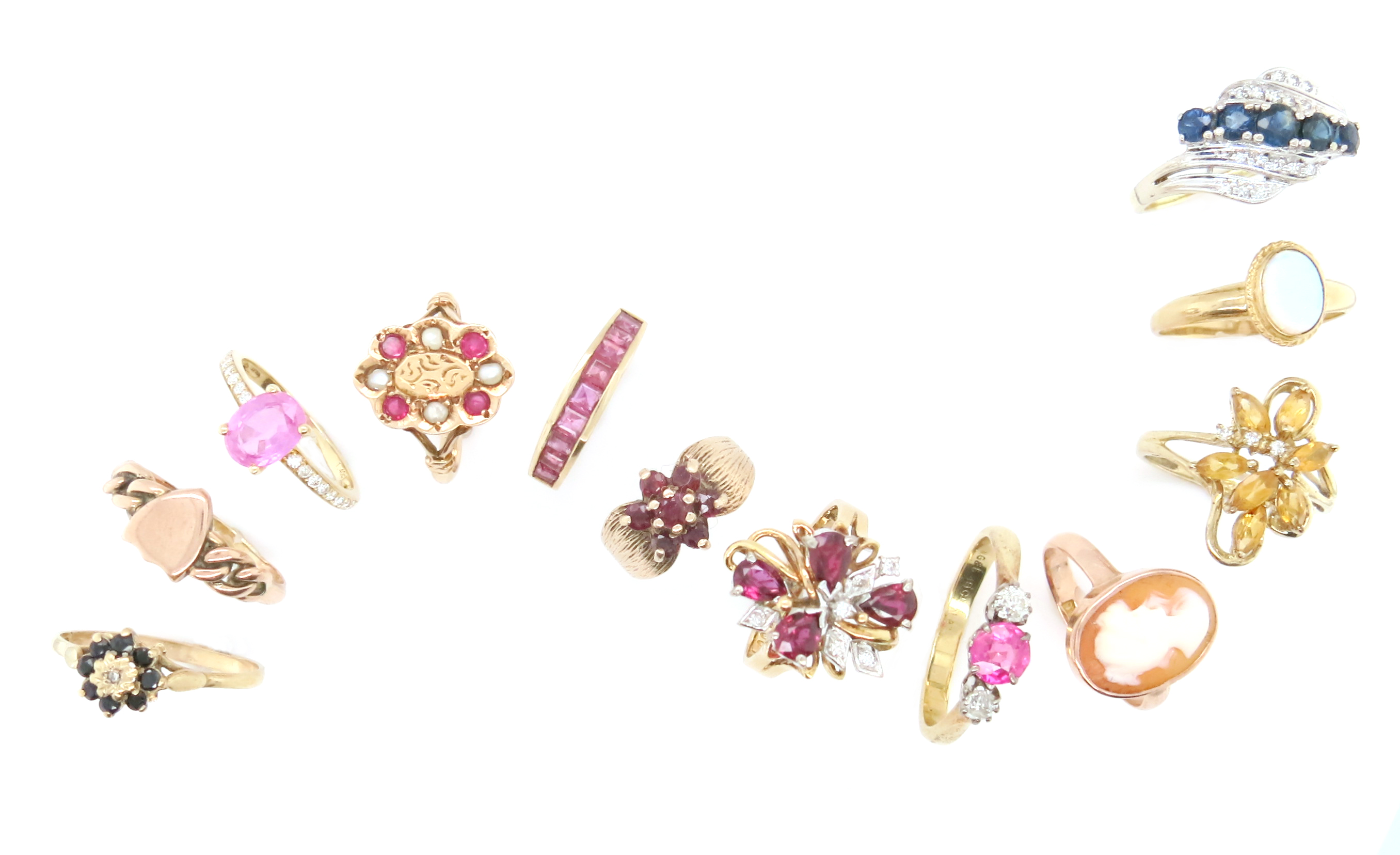 Twelve gem-set rings, including; a ring set with a pink sapphire between circular-cut diamond shoulders, a 9ct gold hallmarked ring channel-set with calibre-cut rubies and ten other gem-set rings, various sizes