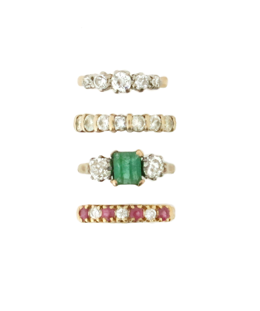 Four gem-set rings, including a diamond five-stone gold ring, a ruby and diamond-set seven-stone gold ring, a diamond seven-stone gold ring, and an emerald and two diamond-set gold ring
