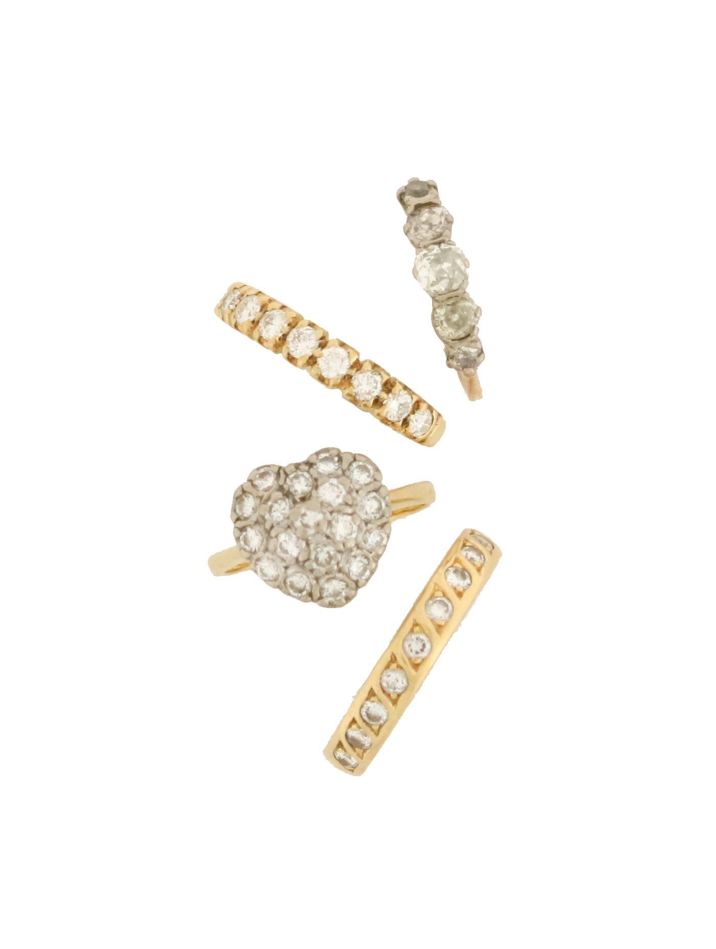 Four diamond rings, including an early 20th century five-stone ring set with circular-cut diamonds, stamped 18ct, size M, two hallmarked 18ct gold half eternity rings each set with nine brilliant-cut diamonds, sizes R and V, and a hallmarked 18 carat gold heart-shaped cluster ring set with brilliant-cut diamonds, size Q1/2