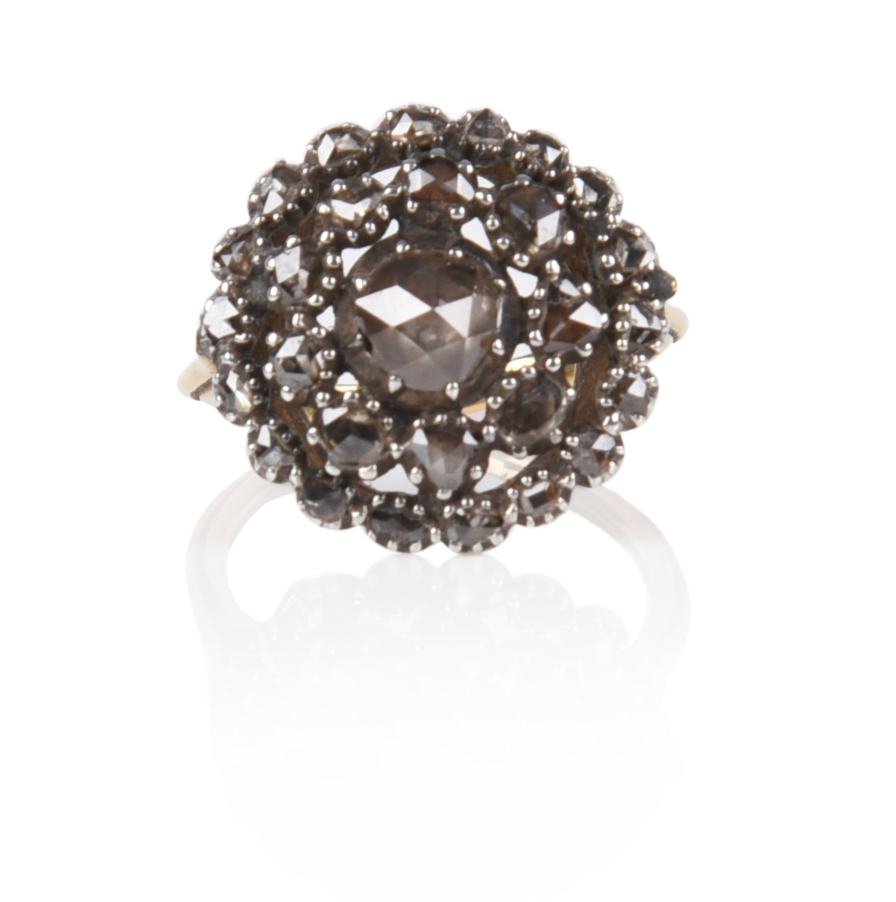 A 18th century diamond cluster ring, centred with a circular-cut (chipped) rose-cut diamonds within two rows of smaller rose-cut diamonds in silver and gold