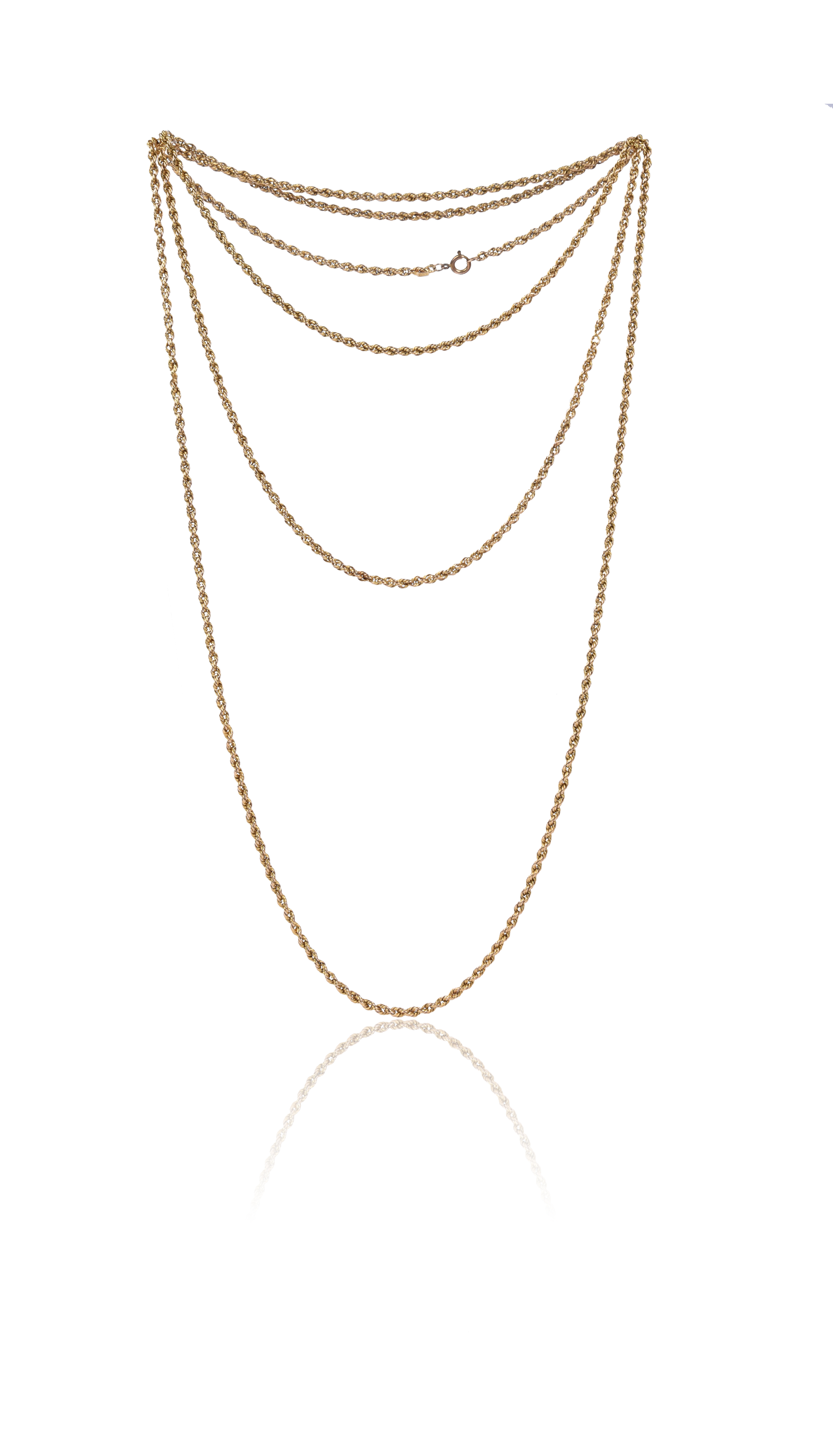 A ropetwist gold longuard chain, stamped 15ct, 168cm long, 51g