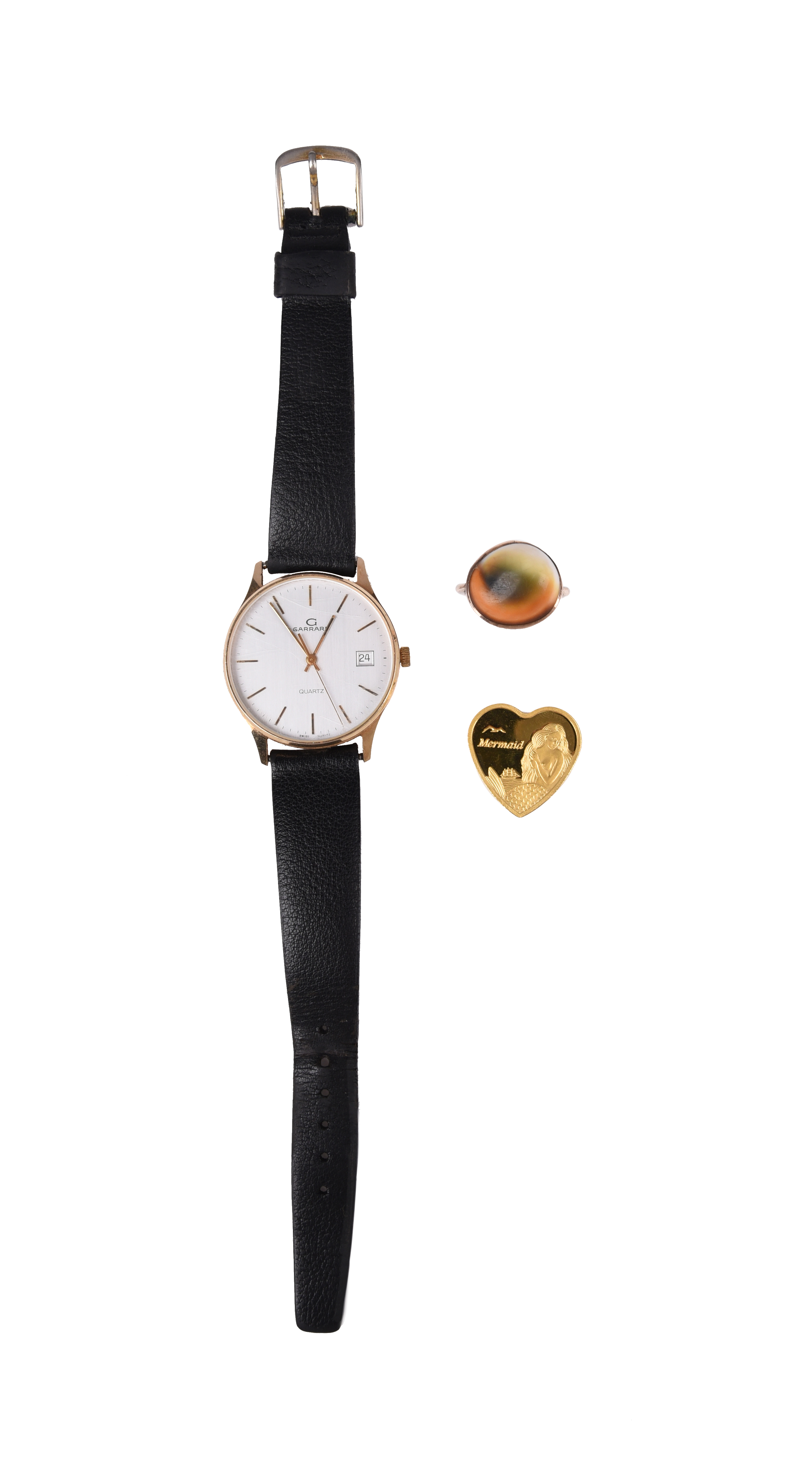 A 9ct gold wrist watch with quartz movement, dial signed Garrard with Garrard box; a gold shaped ingot, 5q; an operculum mounted gold ring.