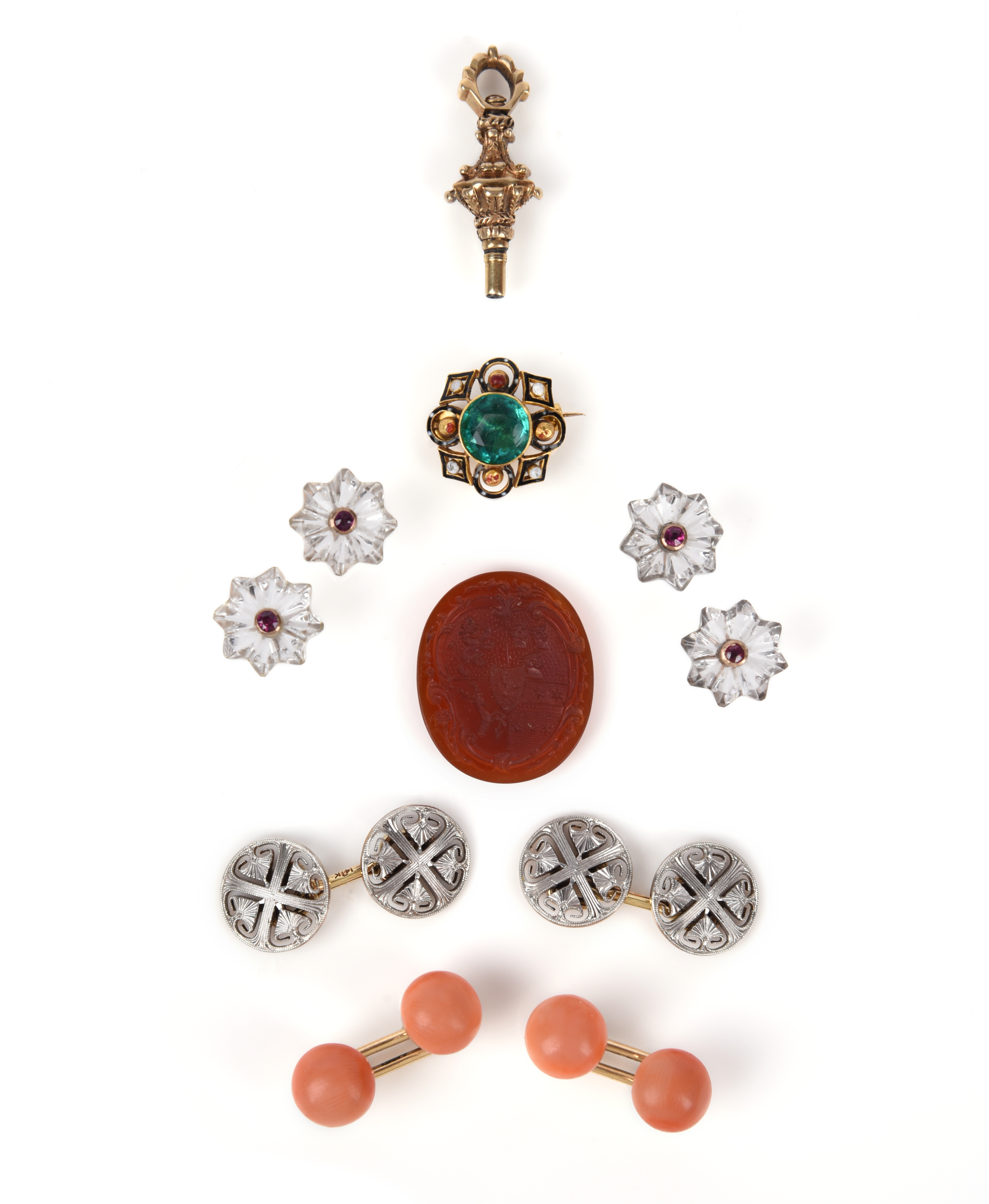 λ A group of jewels including two pairs of cufflinks, one set with coral buttons in gold, the other pair with circular links with openwork scroll motif in platinum on gold, a carnelian intaglio carved with a coat of arms in a rococo border, a set of four carved floral rock crystal buttons set with cushion-shaped garnets, an enamel and foiled green paste brooch in the Renaissance revival manner, and a watch key with foliate decoration