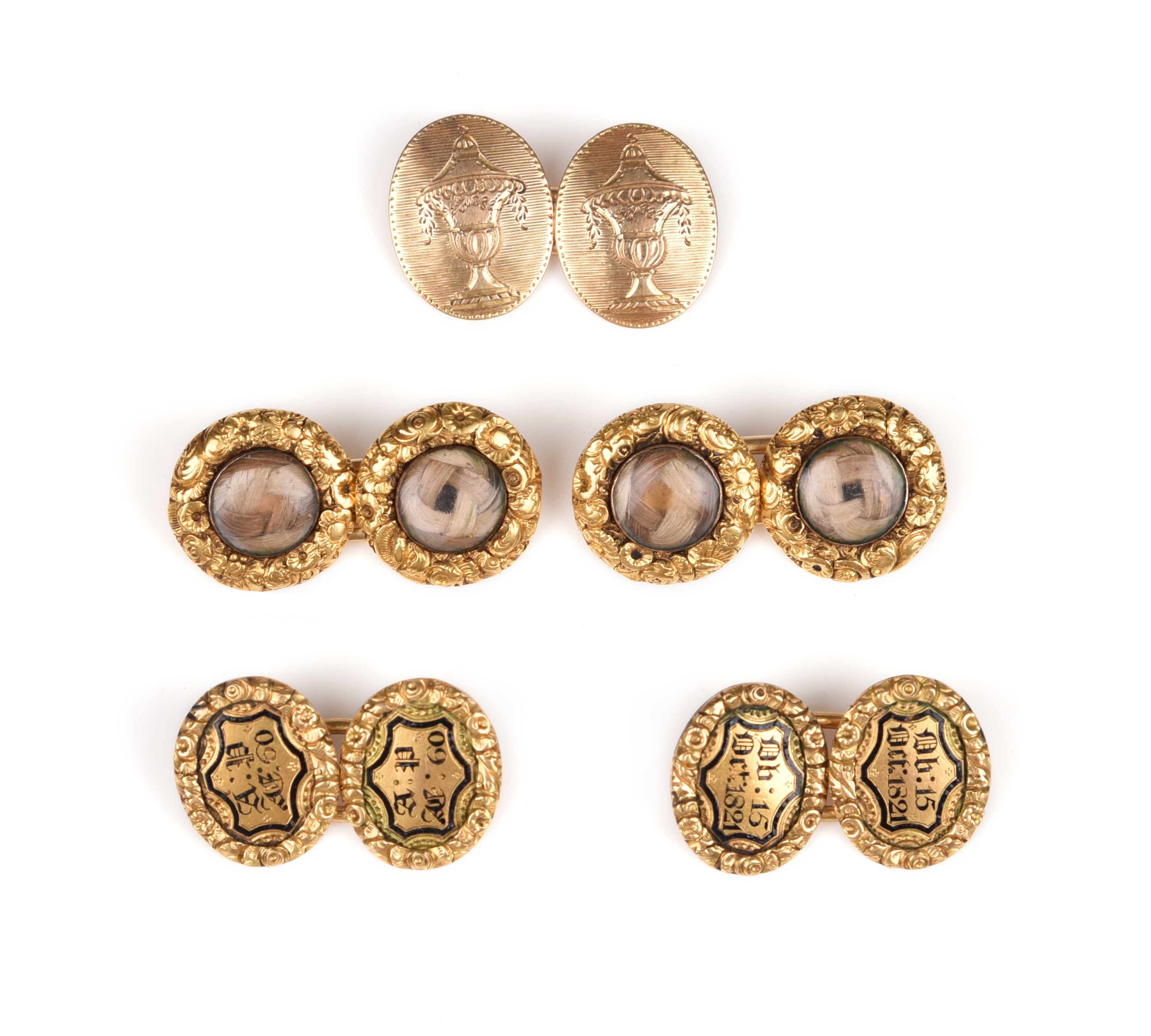A pair of George III and a pair of George IV gold mourning cufflinks, one pair with circular links with foliate engraved borders and glazed compartments containing plaited hair, hallmarks (possibly London 1819); one pair with oval links with foliate engraved borders and black enamel mourning inscription dated 1821; together with a single early 19th century mourning cufflink, the oval gold links engraved with urns