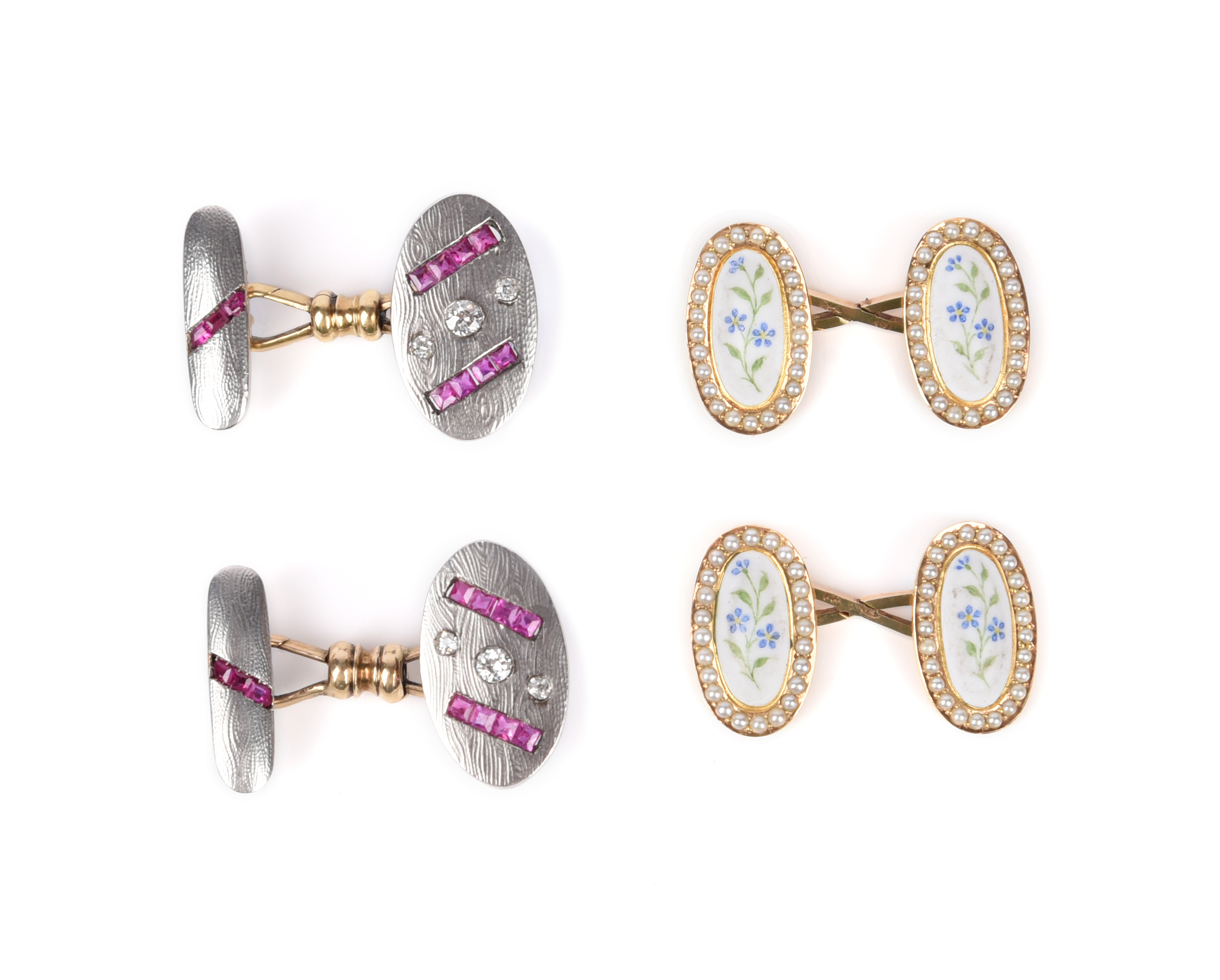 Two pairs of cufflinks, early 20th century, one pair with oval ends enamelled with a design of forget-me-nots within a border of half seed pearls, stamped 14k; the other pair set with calibré-cut rubies and circular-cut diamonds on a woodgrain-patterned ground, French assay marks for 18 carat gold and French maker's marks