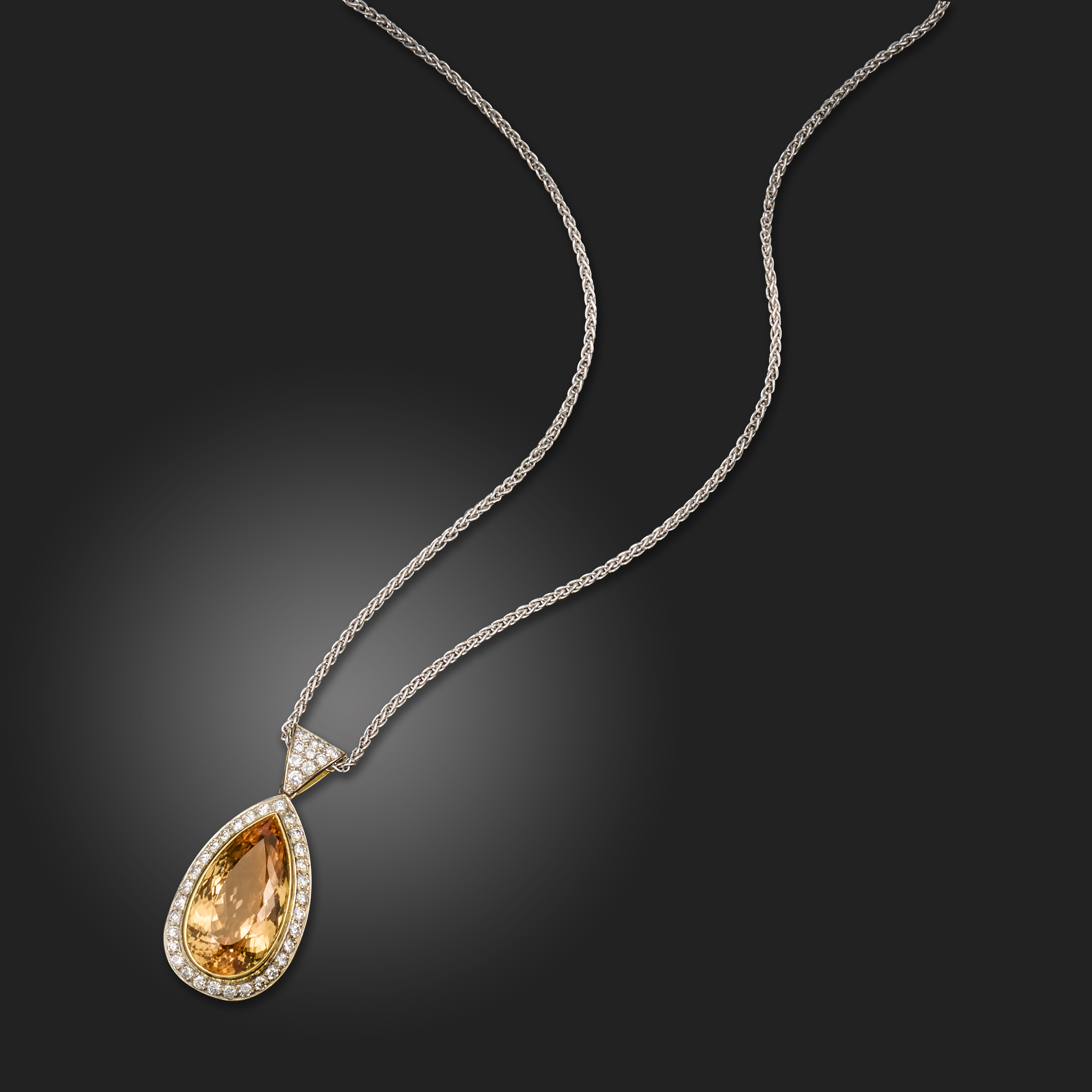 A golden topaz and diamond pendant, the pear-shaped topaz weighing approximately 21.00cts, set within a surround of round brilliant-cut diamonds, suspended from a diamond-set bail in yellow and white gold, 2.8cm high (without bail), on a fine-link white gold neck chain