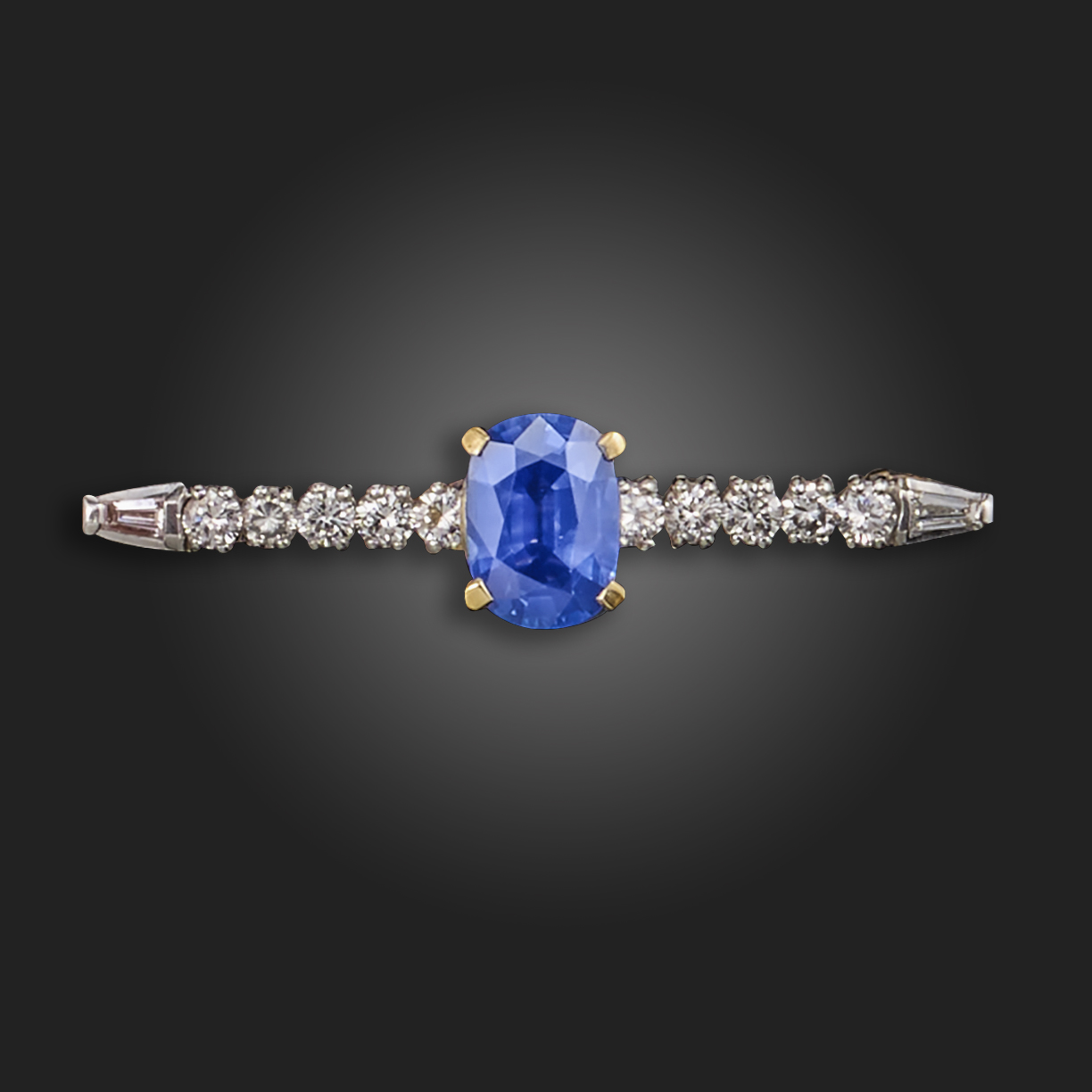 A sapphire and diamond bar brooch, the oval-shaped sapphire is set with five circular-cut diamonds to each shoulder and tapered baguette-shaped diamond terminals in gold, 4.2cm wide