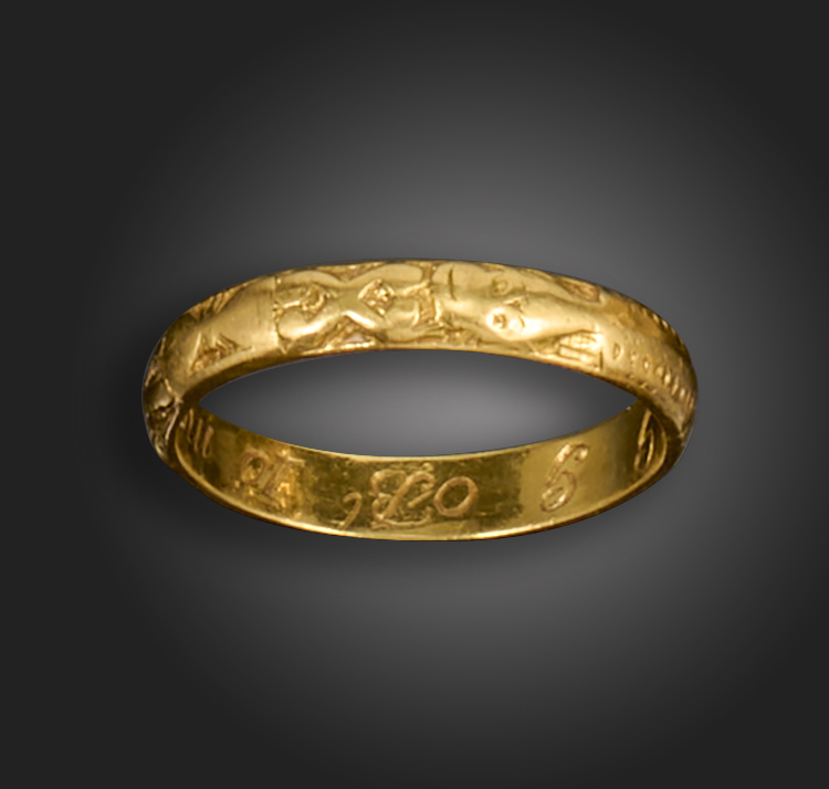 A George I gold memento mori ring, the exterior engraved with a skeleton and cross bones, and a crossed pick and shovel below the feet, engraved to the interior 'Sir G. G. Obt 10th March 1724', maker's mark I.W, size P