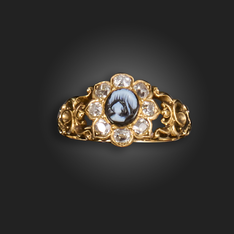 A mid 19th century gold mourning ring, set with a banded agate cameo depicting an urn within diamond border and gold scrolling shoulders, glazed locket compartment to reverse, rubbed inscription to interior, size M