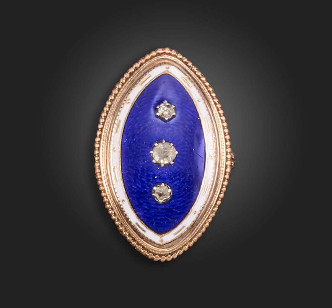 A George III diamond and enamel mourning ring, the navette-shaped ring with blue and white enamel decoration, applied with three rose-cut diamonds, with pellet decoration to the border and engraved decoration to the shoulders in gold, size N