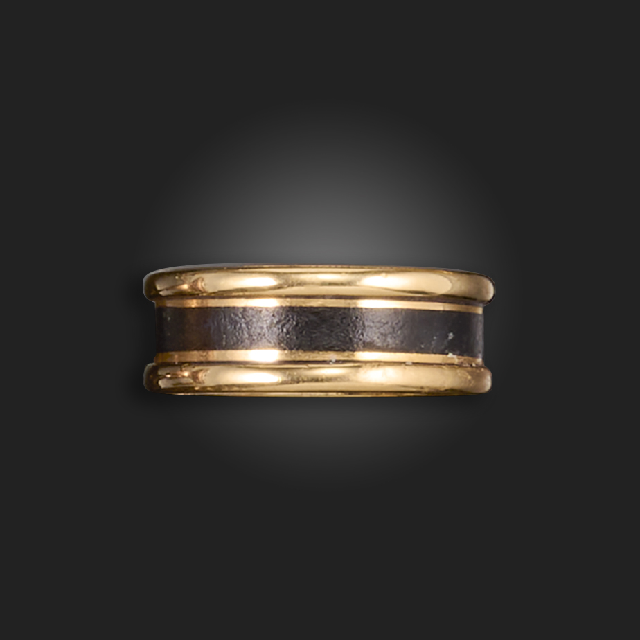 A Victorian gold mourning ring, with a central band of black enamel between gold borders, internal mourning inscription dated 1871, rubbed 18ct hallmarks and maker's mark D&B, size O