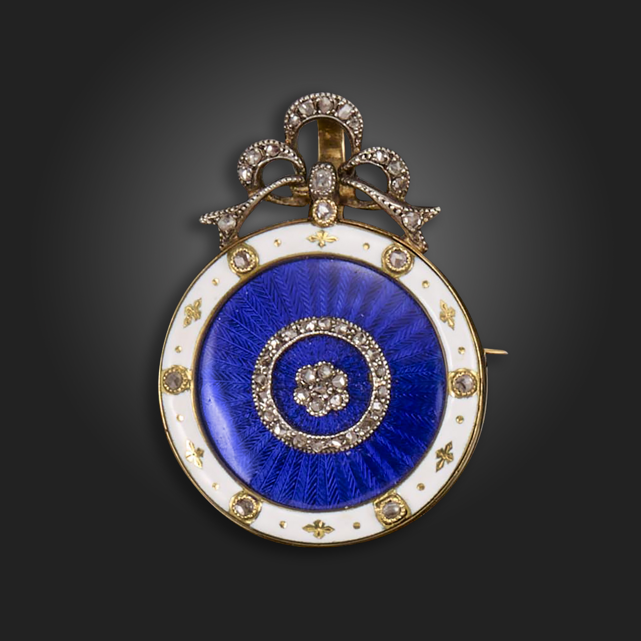 A 19th century enamel and diamond locket brooch pendant, the circular locket with Royal blue guilloché enamel decoration and white enamel border and set with rose-cut diamonds, surmounted by a rose-cut diamond-set bow in silver and gold, glazed locket compartment to reverse, 3.8cm high
