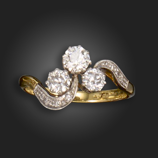 A diamond three-stone ring, set with a trefoil of graduated round brilliant-cut diamonds, set with single-cut diamonds to the shoulders in two-colour gold, size P