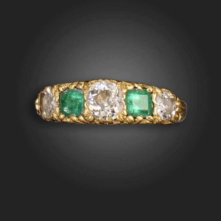 An emerald and diamond gold half-hoop ring, set with three old cushion-shaped diamonds and two emerald-cut emeralds in a pierced and engraved scroll mount, one emerald damaged, 18ct London hallmarks for 1994, size P 1/2