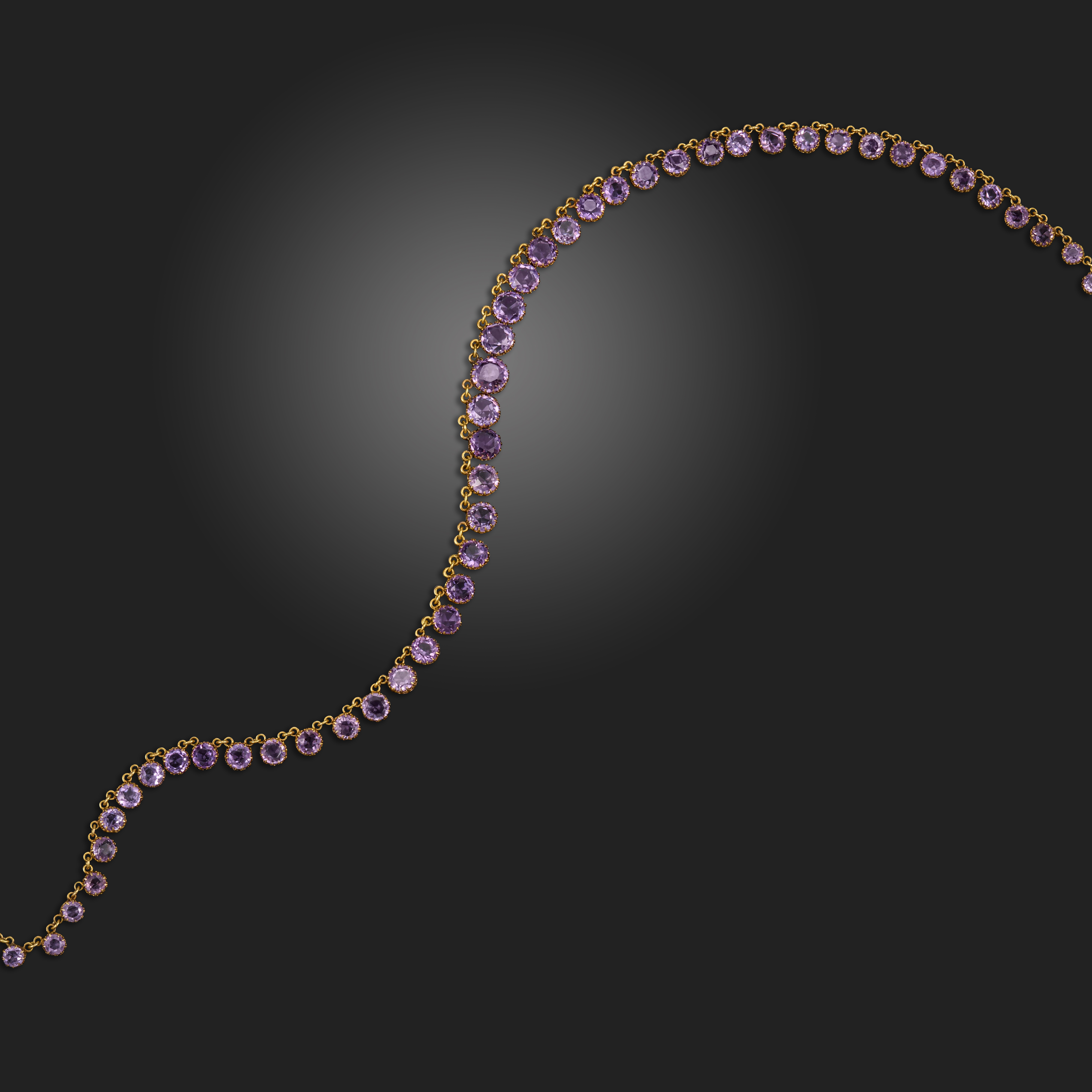 A Victorian amethyst rivere fringe necklace, set with graduated circular-cut amethysts in yellow gold collets, 42cm long
