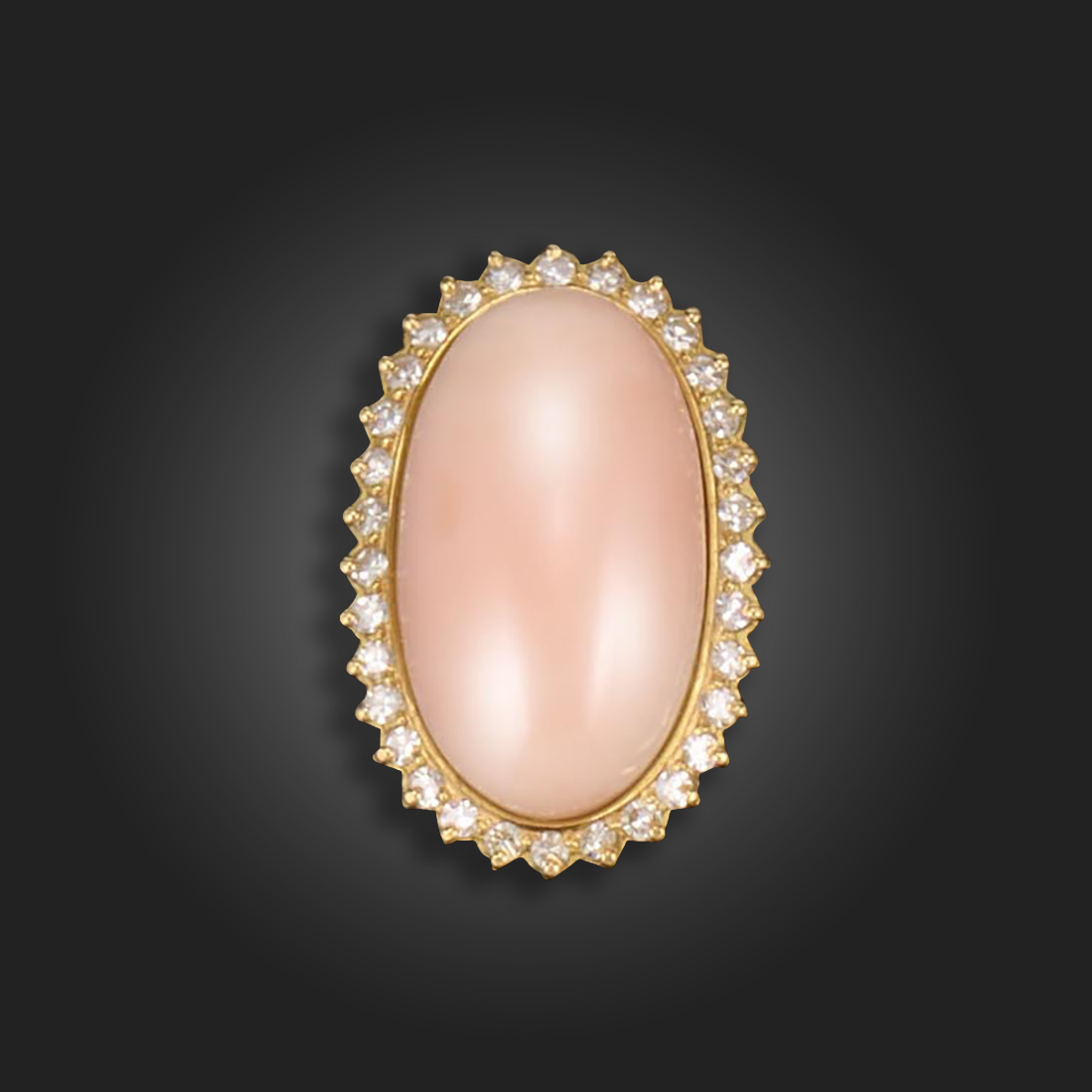 λ A coral and diamond cluster ring, the oval pink coral set within a surround of single-cut diamonds in gold, size K