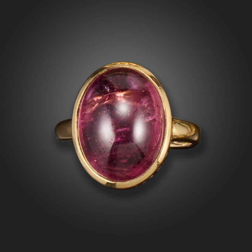 A tourmaline ring, the pink oval cabochon is rubover-set with pierced decoration to the gallery in gold, size N