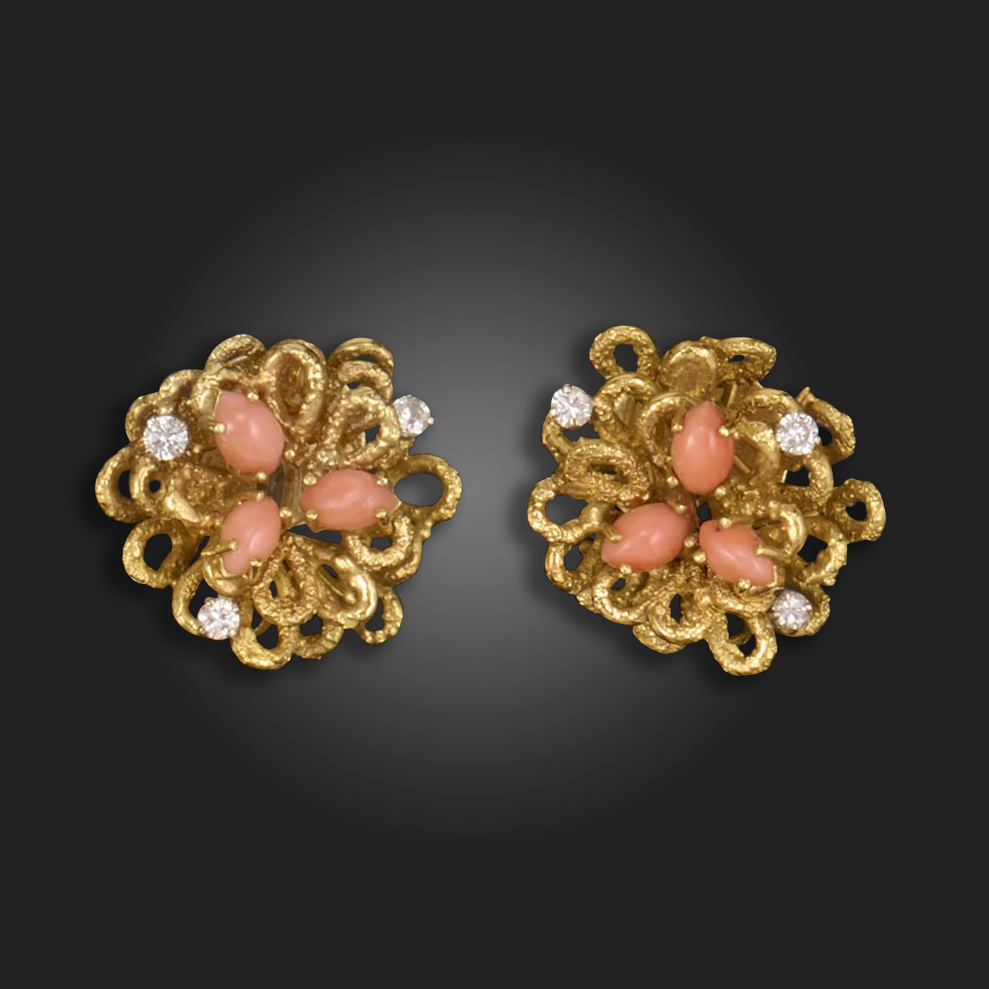 λ A pair of coral and diamond earrings, of flowerhead design, set with marquise-shaped coral cabochons and round brilliant-cut diamonds in textured gold, post fittings, 2.3cm wide, 16.5g
