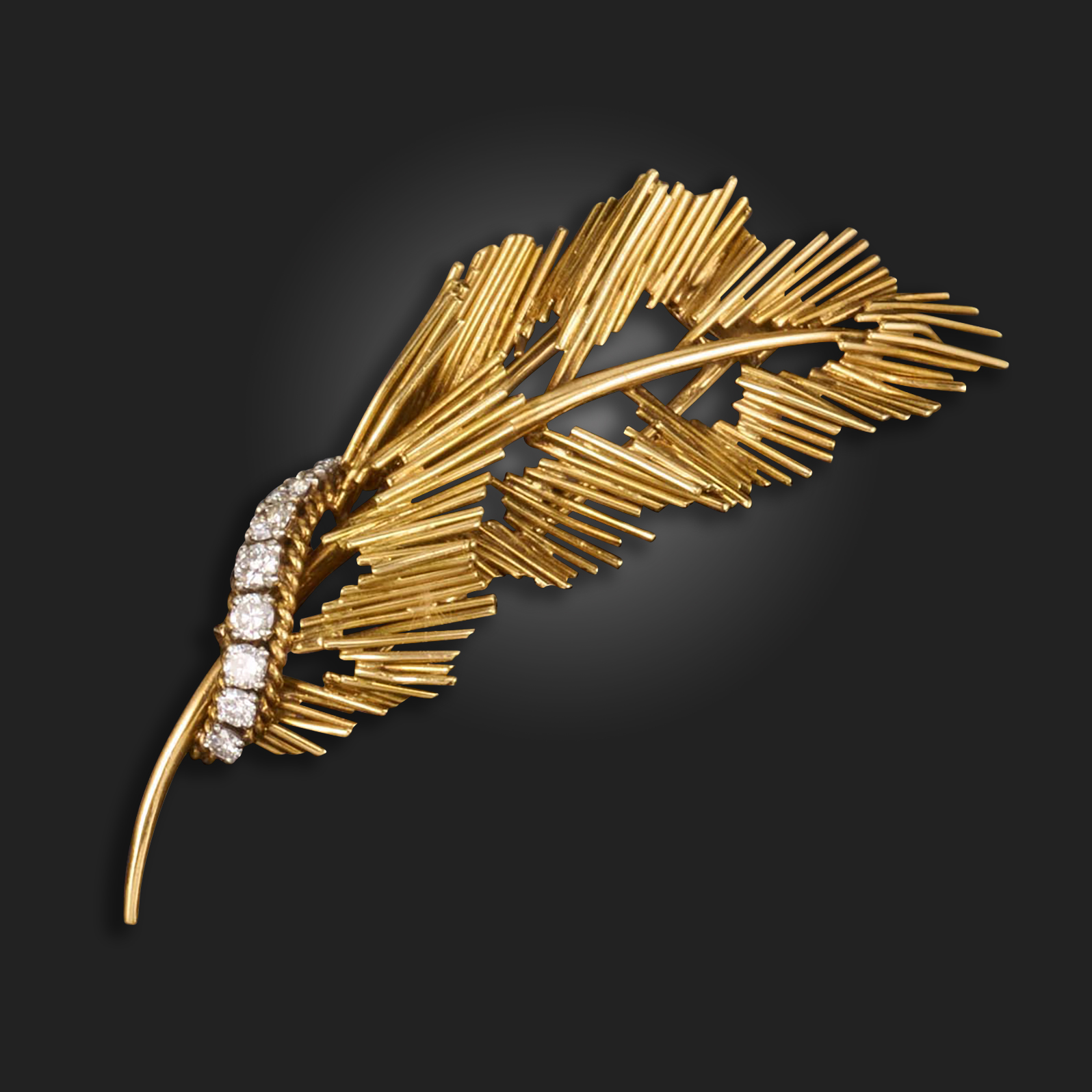 A diamond gold leaf brooch by Boucheron, of open bar design, set with eight graduated circular-cut diamonds, French control marks for gold and platinum, signed 'Boucheron Paris, maker's lozenge RN, inventory number 15162, 6.5cm long