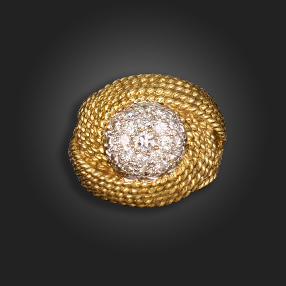 A diamond-set bombe ring, the centre set with graduated round brilliant-cut diamonds within surrounds of twisted intertwined ropes in yellow gold, size L 1/2