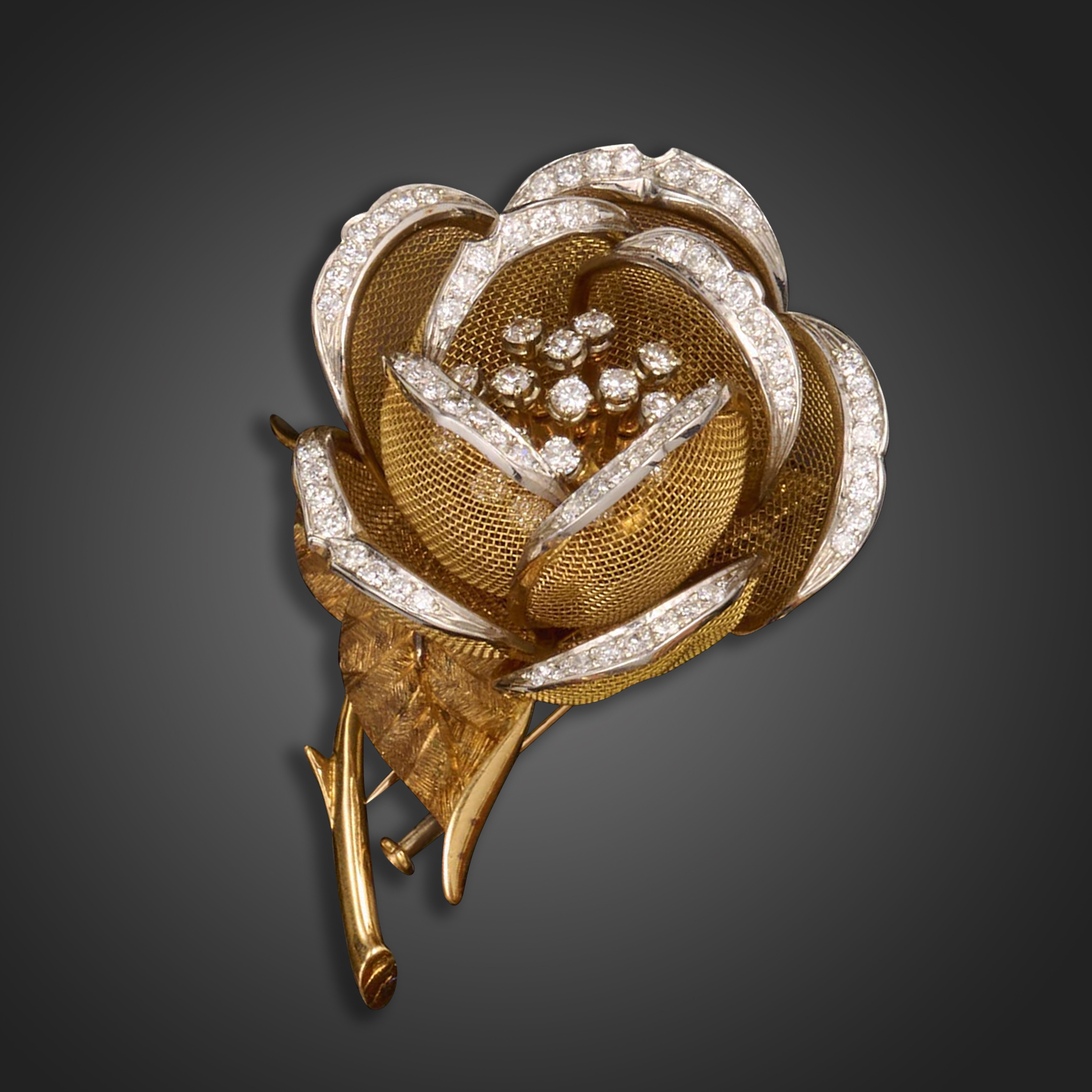 A French diamond-set rose brooch by Jean Ferriere, c.1960's, with articulated diamond-set mesh petals opening to reveal diamond-set stamens, with textured gold leaves to the stem, platinum on gold, French control marks, maker's mark, 6cm high