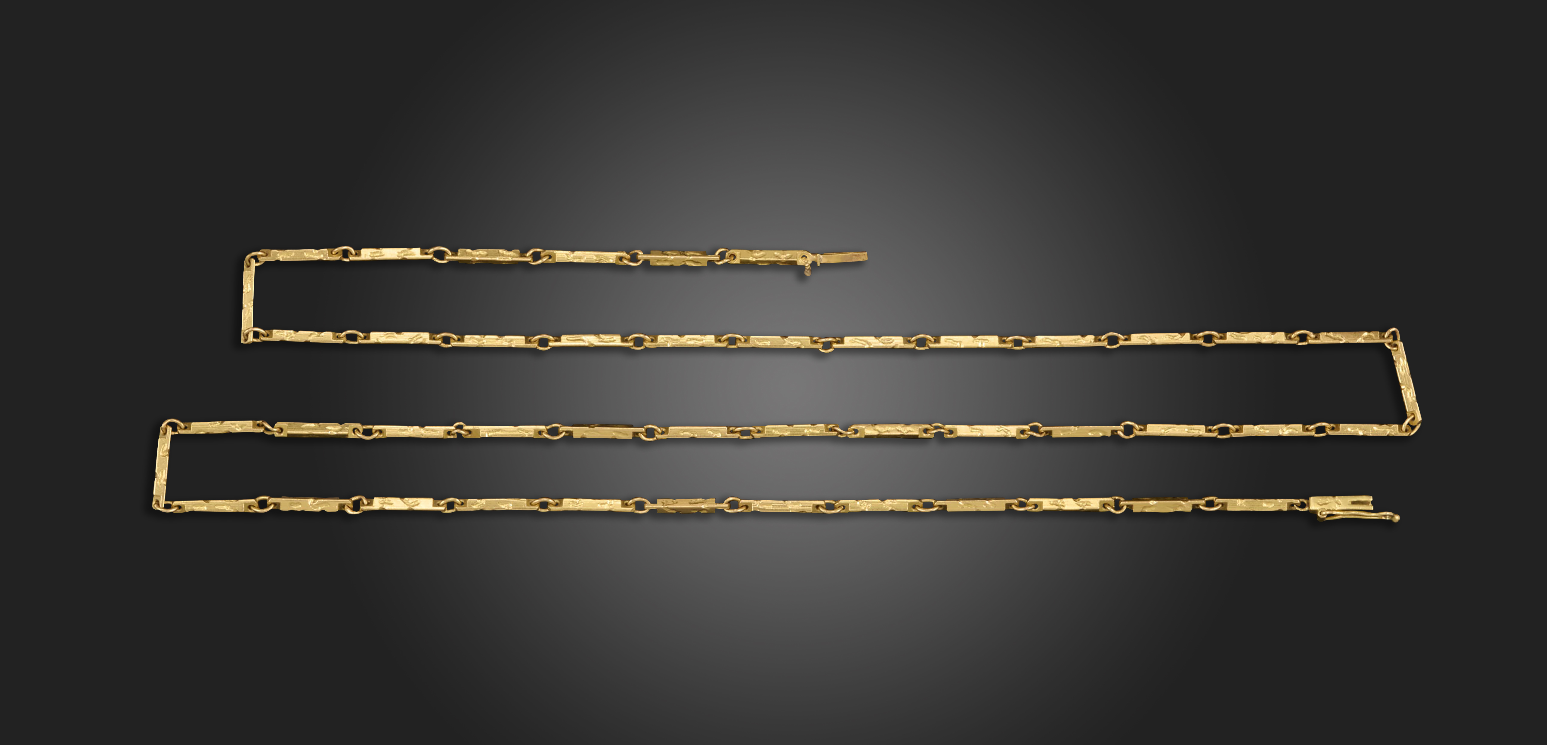 ‡ A gold necklace by Andrew Grima, 1970's, set with rectangular textured gold links, signed AGLtd, 18ct London hallmarks for 1973, 62cm long, 21g