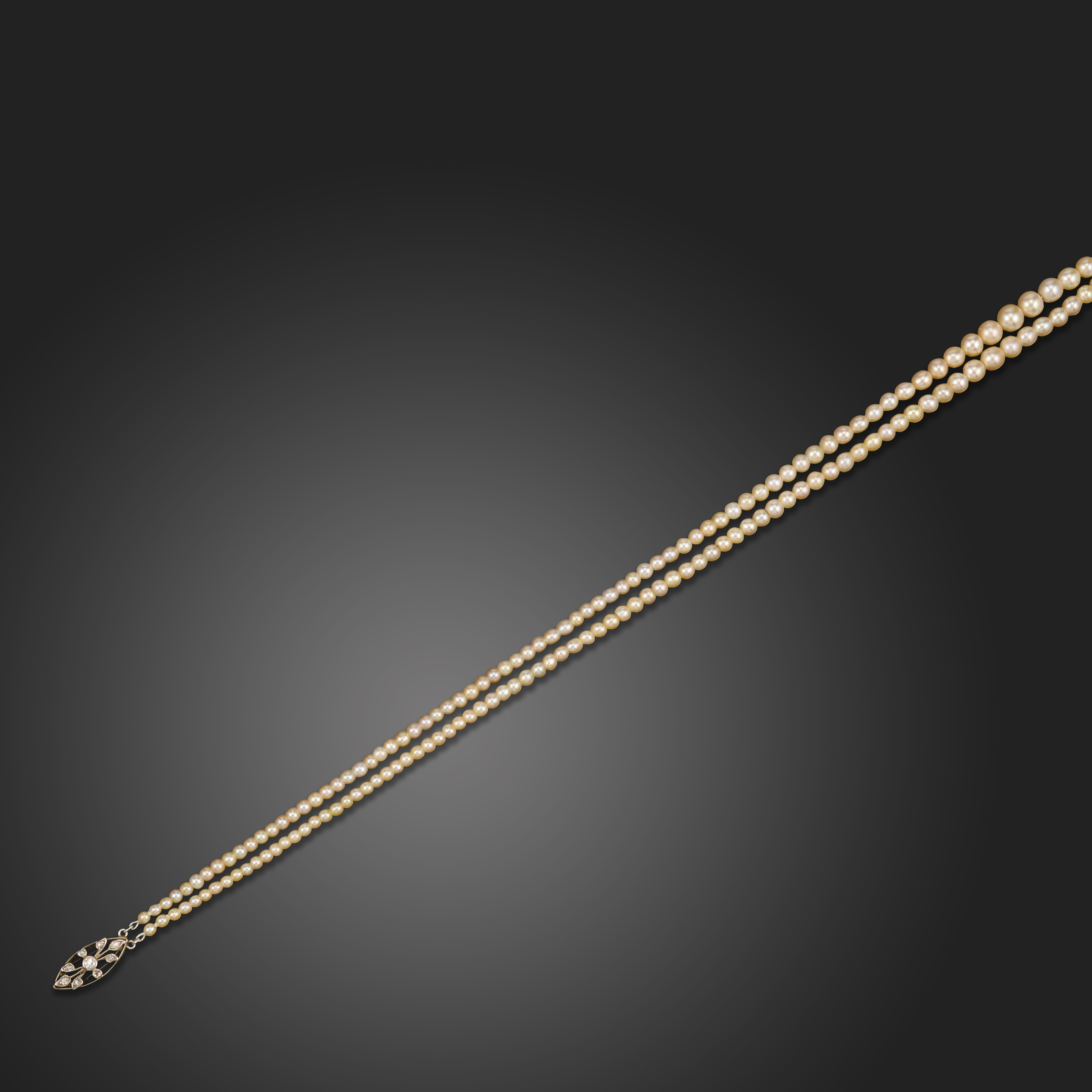 A two-row natural pearl necklace, the pearls graduate from 2.1 - 5.0 mm, with a navette-shaped diamond-set white gold clasp, 41cm shortest