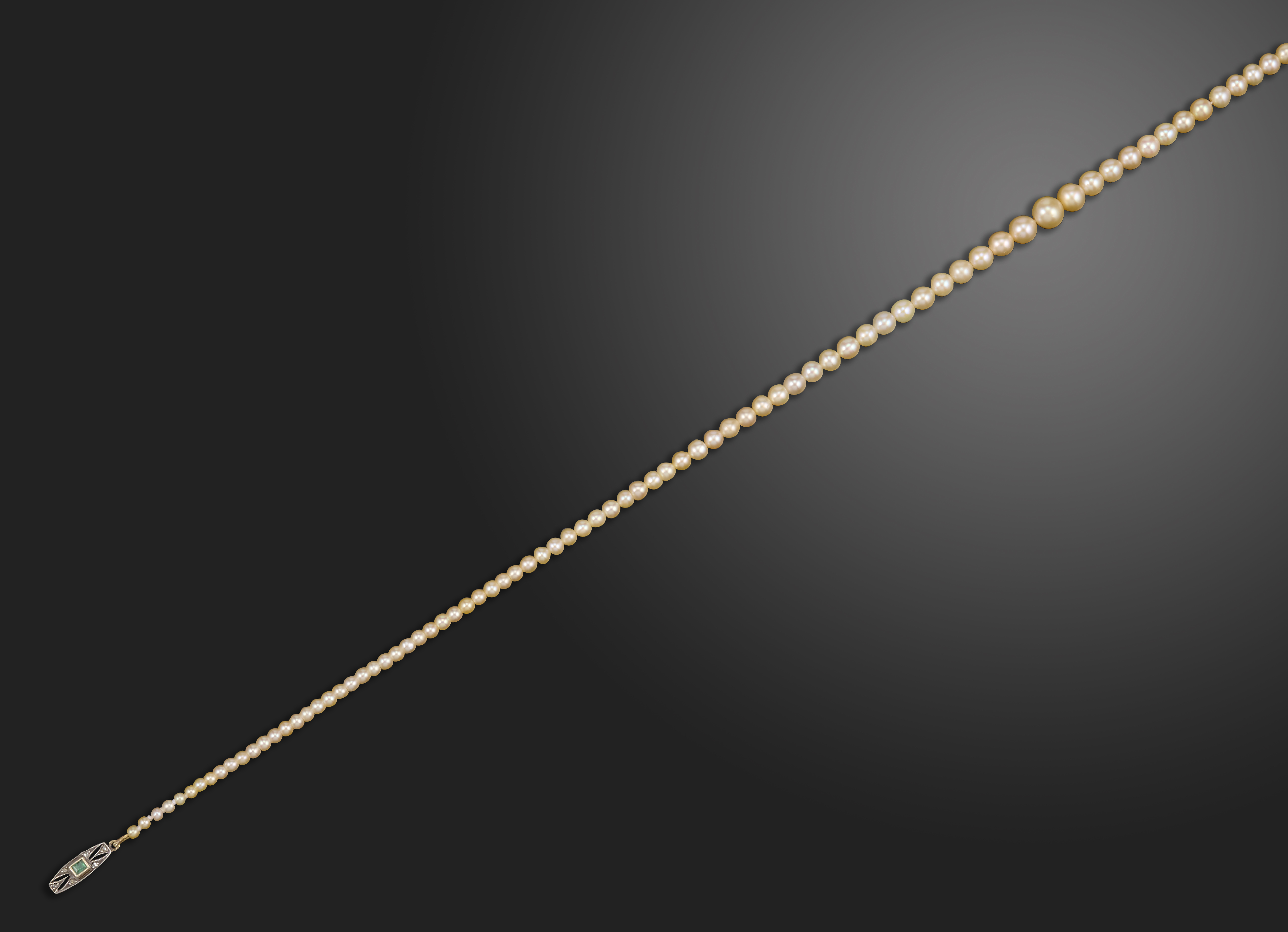 A single-row natural pearl necklace, the pearls graduate from 2.10 - 5.73mm, the cluster clasp set with an emerald and rose-cut diamonds in silver on gold, 40cm long, 7.2g