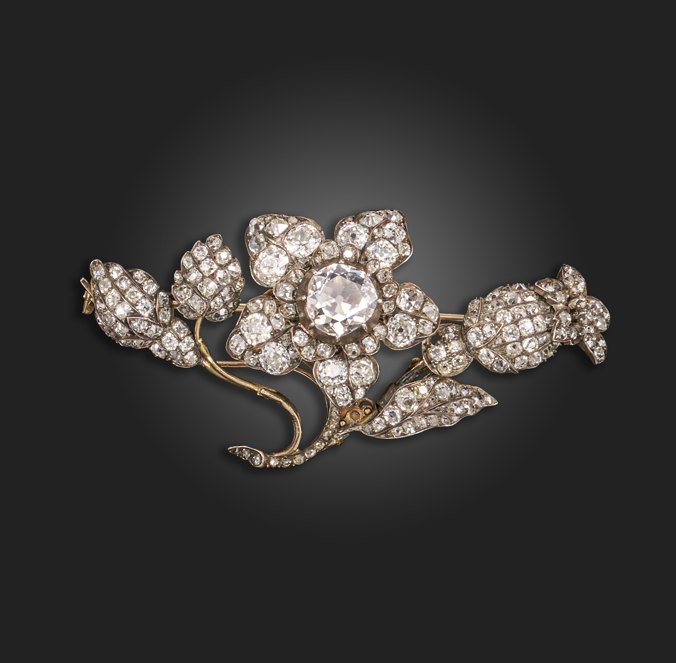 An early 19th century diamond-set foliate brooch, the centre diamond flowerhead cluster mounted 'en tremblant' and centred with a large asymmetrical circular-cut diamond in a cut-down collet, within a diamond-set pendant, further diamonds set to the leaves and flowerheads in silver and gold, detachable brooch fitting, 7cm wide, fitted case by S.J.Phillips, additional brooch fitting