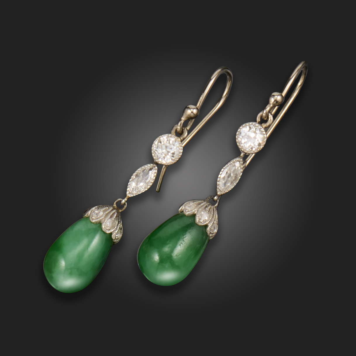 A pair of jade and diamond drop earrings, the articulated earrings set with an old circular-cut and marquise-shaped diamond, suspending a jade drop with a rose-cut diamond-set cap in platinum, hook fittings, 4.4cm high including fittings